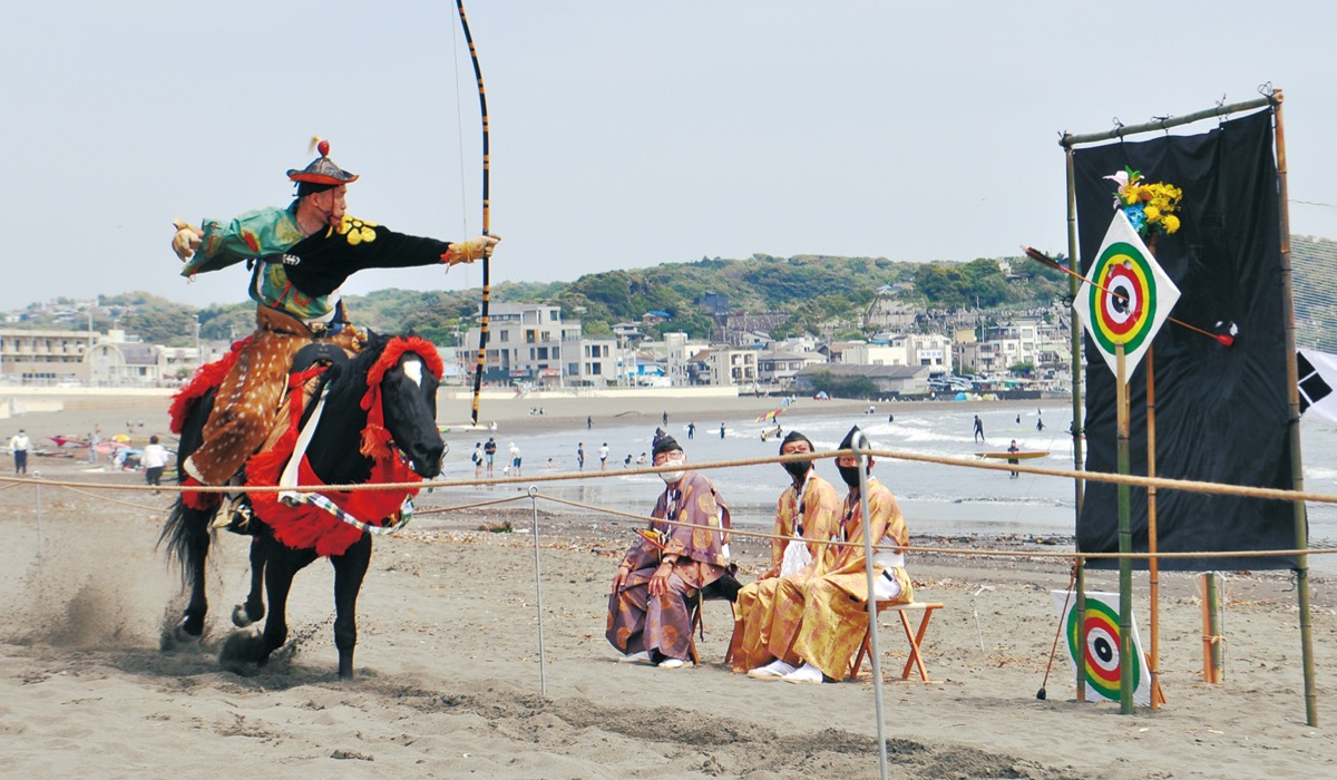 天下泰平と五穀豊穣を祈る流鏑馬(やぶさめ)が23日、片瀬海岸東浜で催された=写真。昨年11月に続く2度目の開催で、新型コロナウイルスの終息祈願も込めた。砂浜には約300mの馬場を設置。武田流の射手が疾走する馬上から矢を放ち、的中すると観客からは歓声と拍手が送られた。この日は時代衣装を着て関係者が砂浜を練り歩く武者行列も行われた。