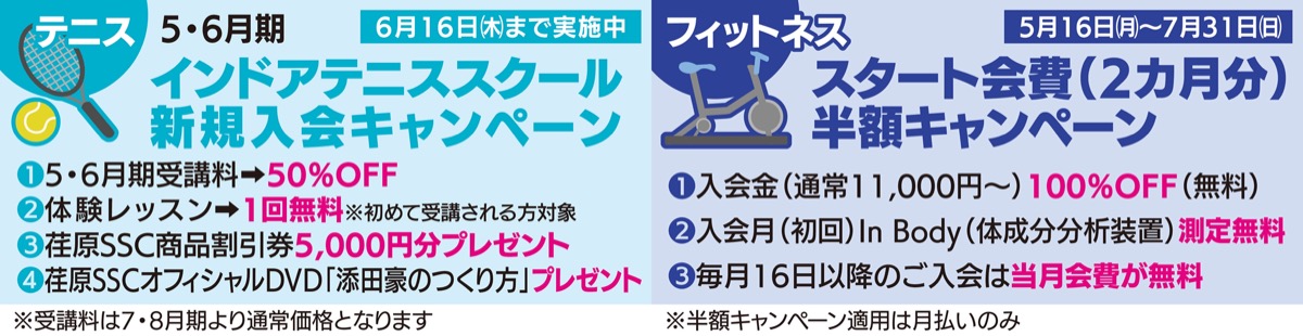 テニス、フィットネスとも入会キャンペーンを実施。国内有数の施設で新しいことを始めてみて。