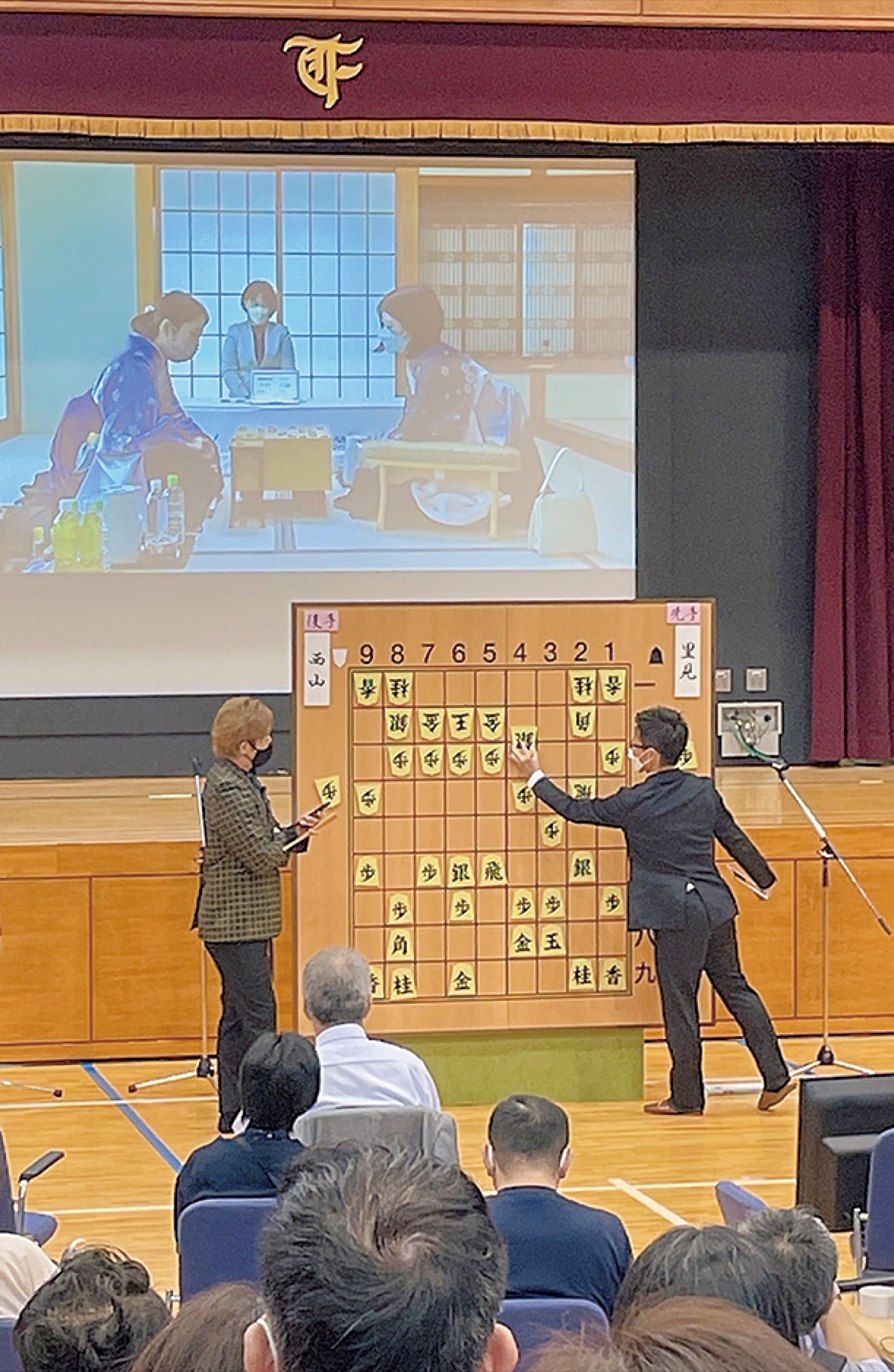 同寺隣接の藤嶺学園の体育館で、対局中継と木村一基九段と戸辺誠七段による大盤解説も実施。来場者は対局の行末を固唾をのんで見守った。