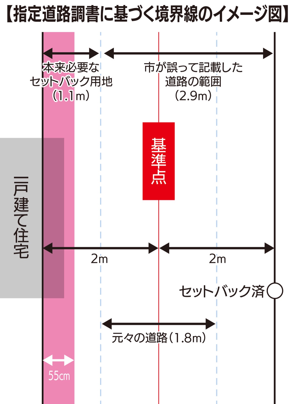 市では14〜17年に業務委託で道路の位置や種類、幅員をまとめた「指定道路調書」を作成。業者が基準点を市に問い合わせた際、市が元々の狭い道路ではなく、反対側がすでに拡幅された状態で伝えたため、業者側が道路範囲を誤認した。本来の境界線よりも55cmずれていたという。