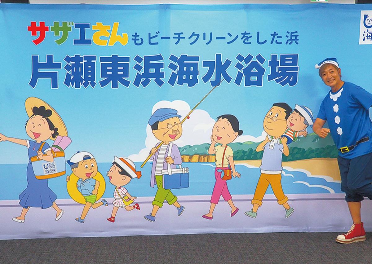 きょう7月1日(金)に海開きを迎える片瀬東浜海水浴場では、今夏限定で国民的アニメ「サザエさん」と連携し、海洋環境保全や清掃活動に取り組んでいく。