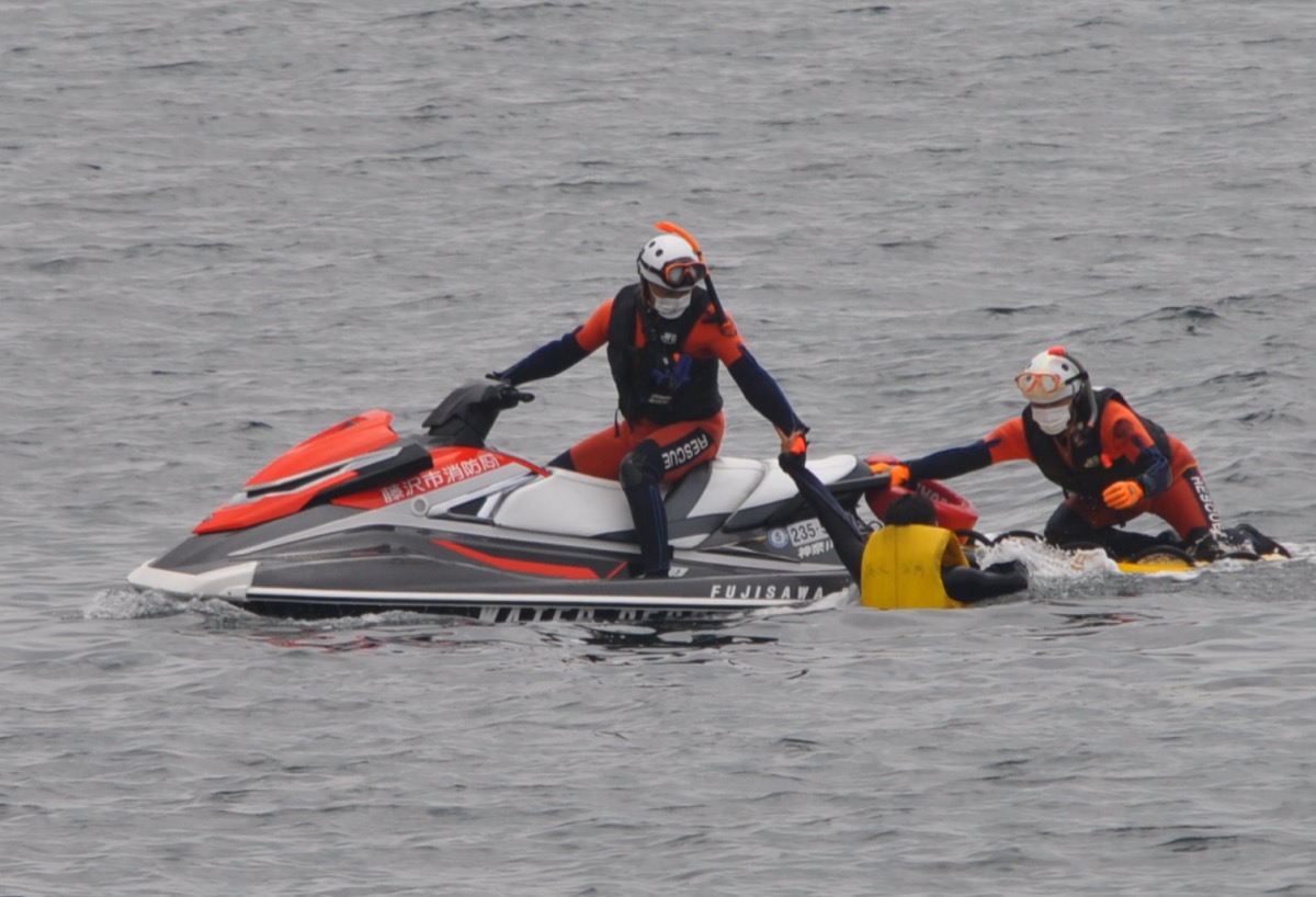 落水事故では鵠沼水難救助隊が水上バイクで出動し、現場を捜索。発見した人を引き上げた。