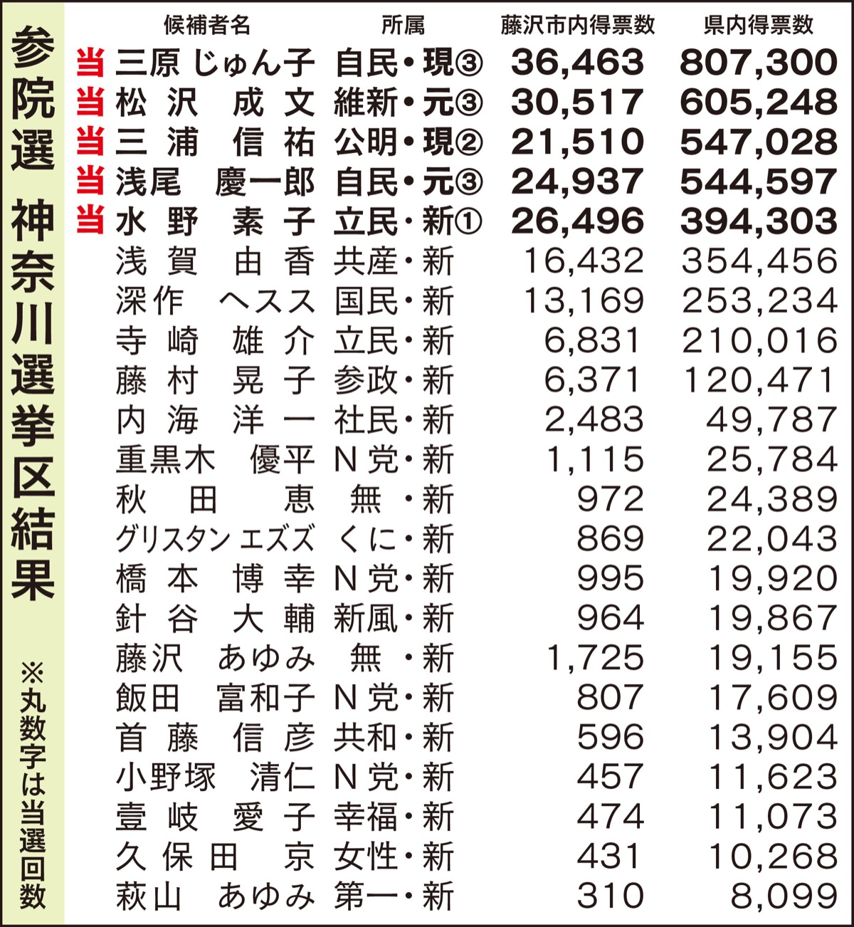 参議院議員選挙の投開票が7月10日に行われた。改選4と欠員補充1の計5議席を過去最多の22人で争った神奈川選挙区は、自民党の現職・三原じゅん子氏(57)が約80万7千票を獲得し、トップ当選。以下、日本維新の会の元職・松沢成文氏(64)、公明党の現職・三浦信祐氏(47)、自民党の元職・浅尾慶一郎氏(58)、立憲民主党の新人・水野素子氏(52)が当選した。