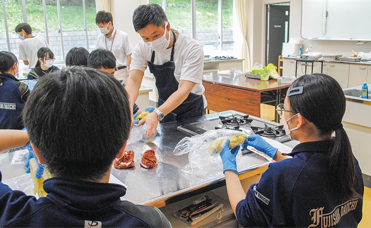 焼肉店経営のエピソードやオリジナルのキムチの作り方を教えた(株)エムワイ代表取締役の吉田亘良社長は「日頃の仕事のことはもちろん、今、学ぶことの大切さも話した。伝わっていたらうれしい」と話した。