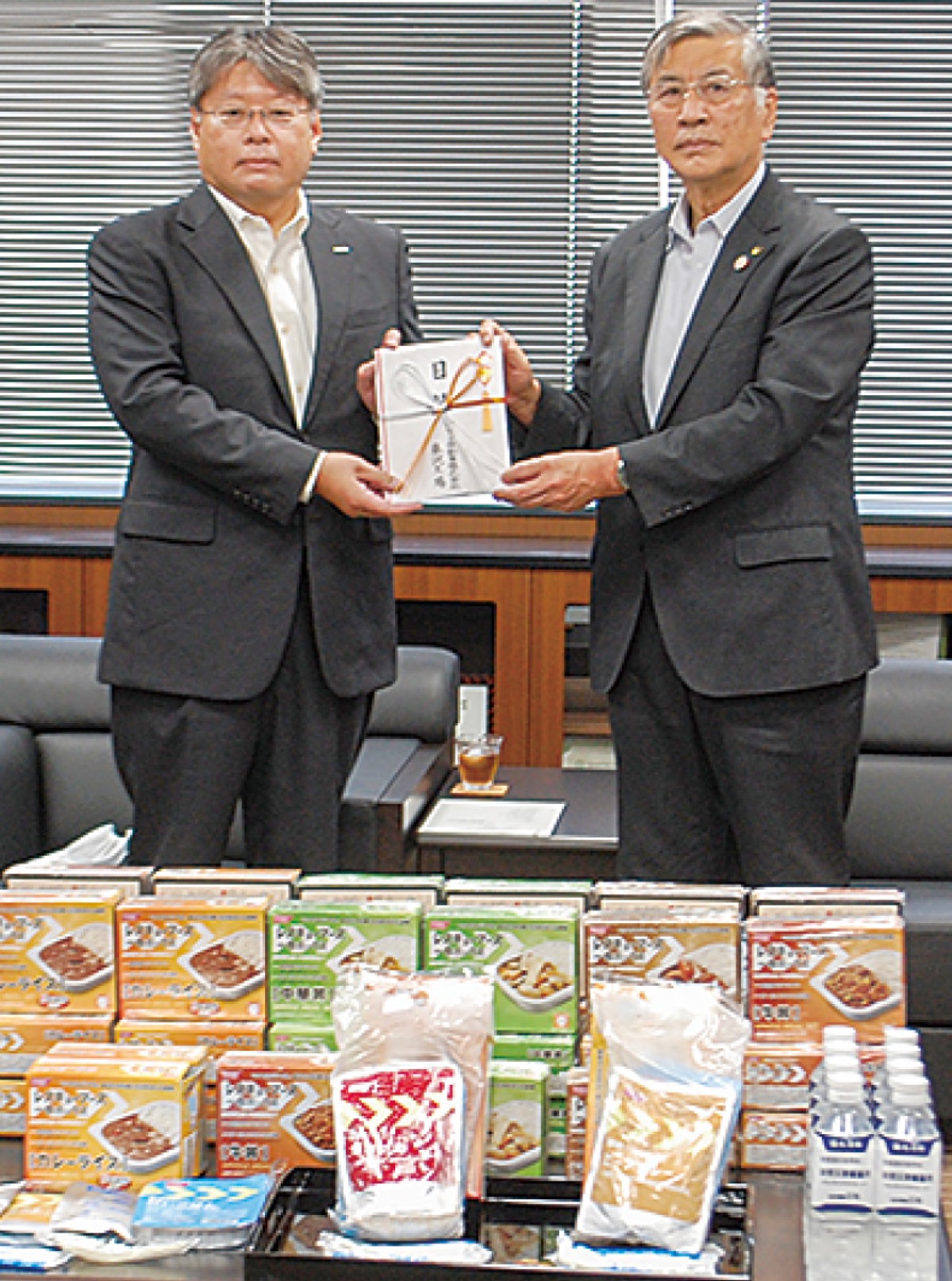 寄贈した食料品は、牛丼と中華丼、カレーライス、シチューライス合わせて8568食と、ペットボトル500ml入りの水1万2480本。同社藤沢工場長の木島克哉さんは「持続可能な地域社会や貧困問題の解消への取り組みの一環。食料品やガソリンなどの価格高騰により困窮されている皆様への支援になれば」と話した。鈴木恒夫市長は「市民の方に喜んでもらえると思う」と謝意を示した。