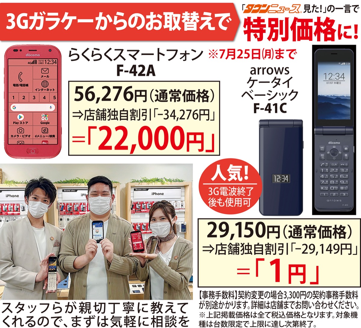 同店ではガラケーから機種変更時に「TN(タウンニュース)を見た!」の一言で、人気のスマホ=写真=が半額以下で購入できる。3G電波終了後も使える折り畳み携帯として人気の1台はなんと「1円」に!スタッフが親切丁寧に対応してくれるので、この機会に足を運んでみては。