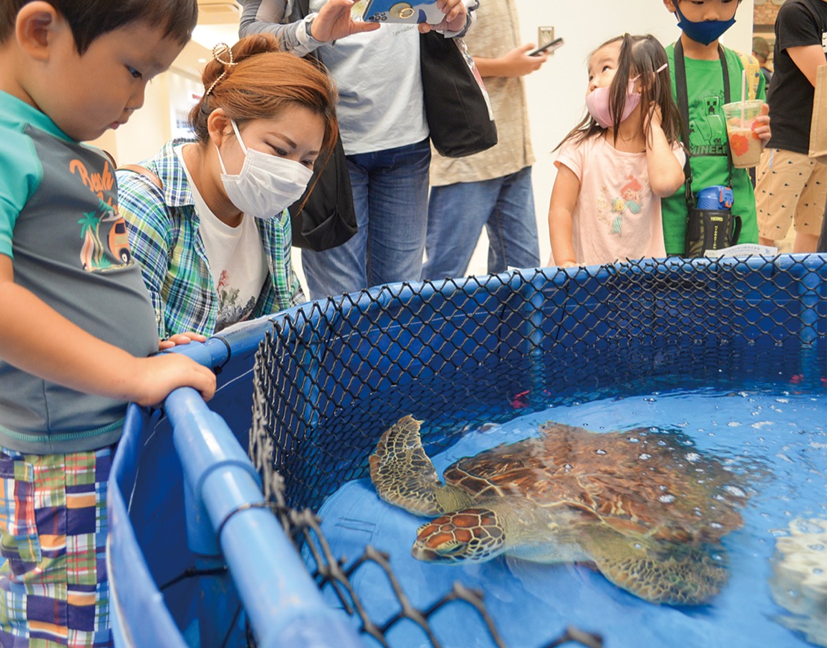 目玉の一つは、「商業施設での展示が珍しい」(同施設)というアオウミガメの展示。円形プールで優雅に泳ぐ様子をえのすいスタッフが解説すると、親子連れから「大きいね」「カメがいるよ」と声が上がった。リクガメに触れるコーナーやシラス、ミズクラゲの水槽展示も興味津々で観察する様子が見られた。