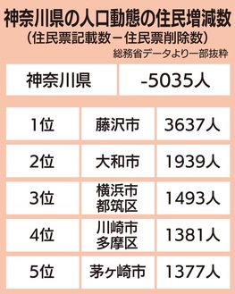 藤沢市の社会増率は1・04%(県平均0・27%)。出生数から死亡数を引いた自然増はマイナス0・21%で、差し引きで社会増が上回った。総合した人口増減率でも、開成町の0・89%に次ぐ0・83%で県内2位となっている。