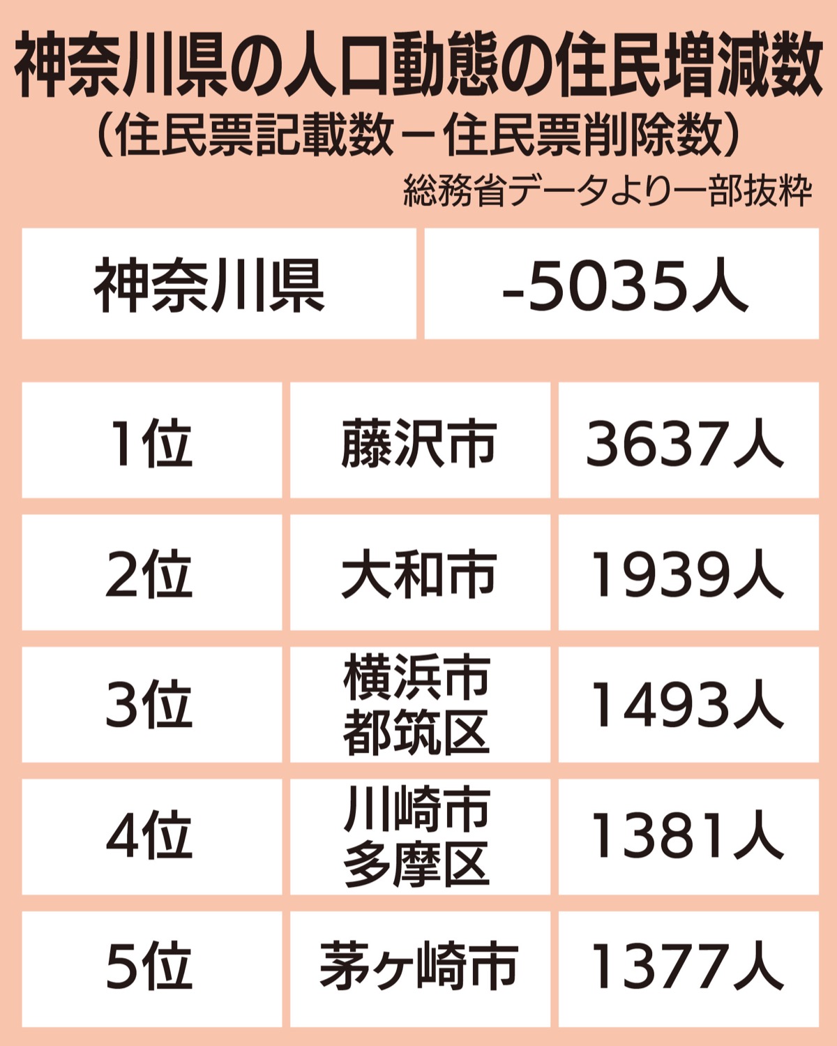 総務省は9日、2022年1月1日時点の全国人口動態調査を発表した。藤沢市の人口は44万3053人で前年より3637人増加し、県内トップの増加数となった。転入者から転出者を引いた社会増の増加率も県内一だった。利便性と自然環境を合わせ持つ「湘南人気」が影響しているとみられ、市では移住者の増加を受け「継続して住んでもらえる地域づくりを進めていく」としている。