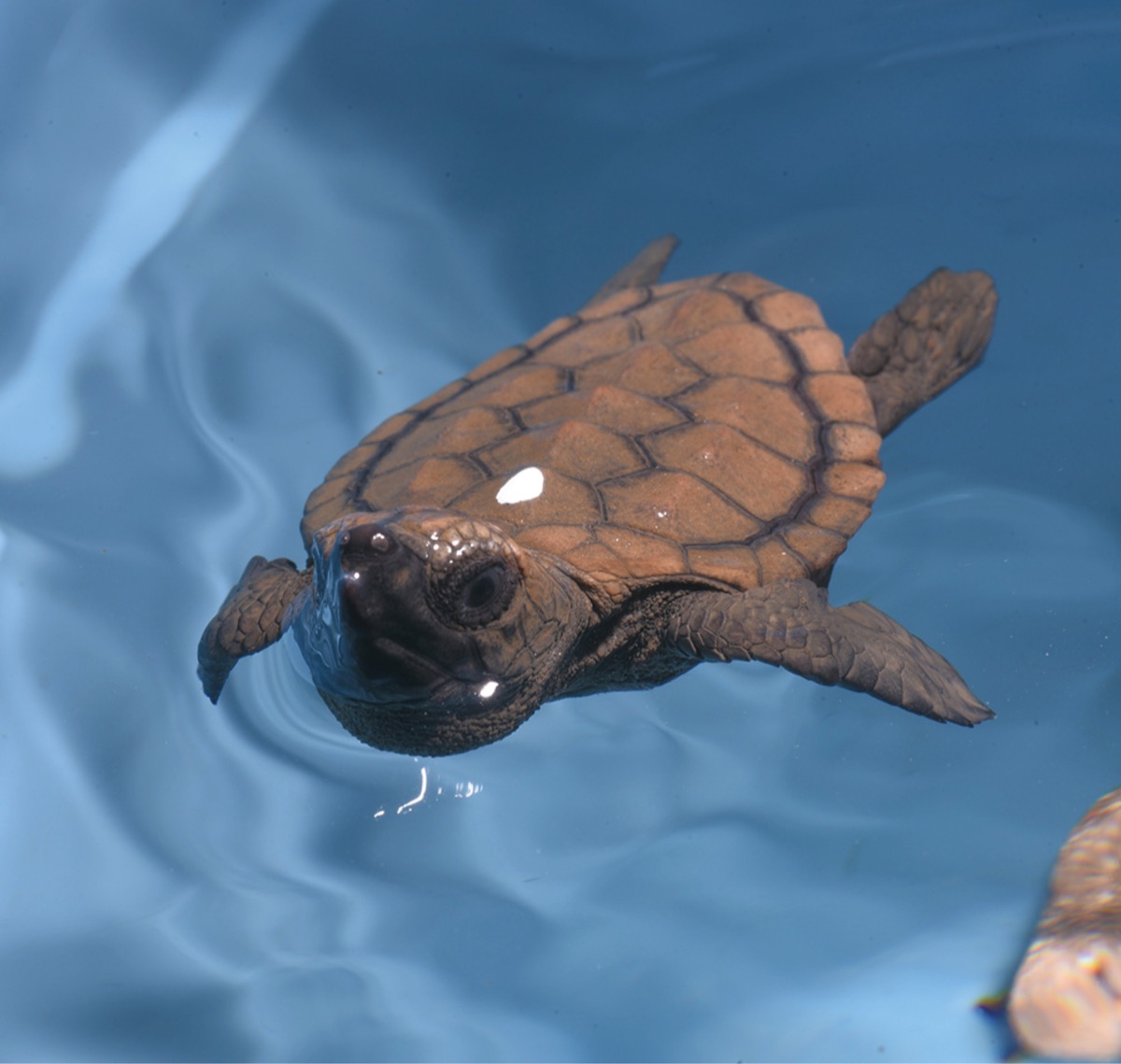 アカウミガメは環境省レッドデータブック絶滅危惧IB類に指定。太平洋、インド洋、大西洋などに分布し、成体になると甲羅の大きさは1mほどになる。生まれたときの大きさは甲長4cm、幅3cm、体重約20g。鼻と口の間にある卵の殻を割るための「卵角」と呼ばれる突起や、前肢を甲羅の上に乗せて浮かぶ様子は子ガメの時期にしか見られないという。