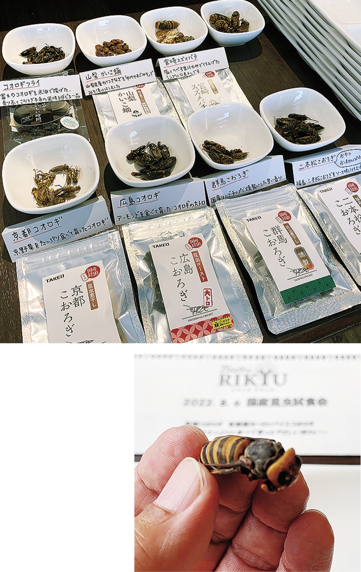 向かった先は今年2月にオープンしたビストロ「RIKYU(リキュウ)」。この日は産地の異なるコオロギとカイコ、スズメバチの計8種類が並んだ。青リンゴのような香りが特徴という「タガメサイダー」なる商品も陳列されている。