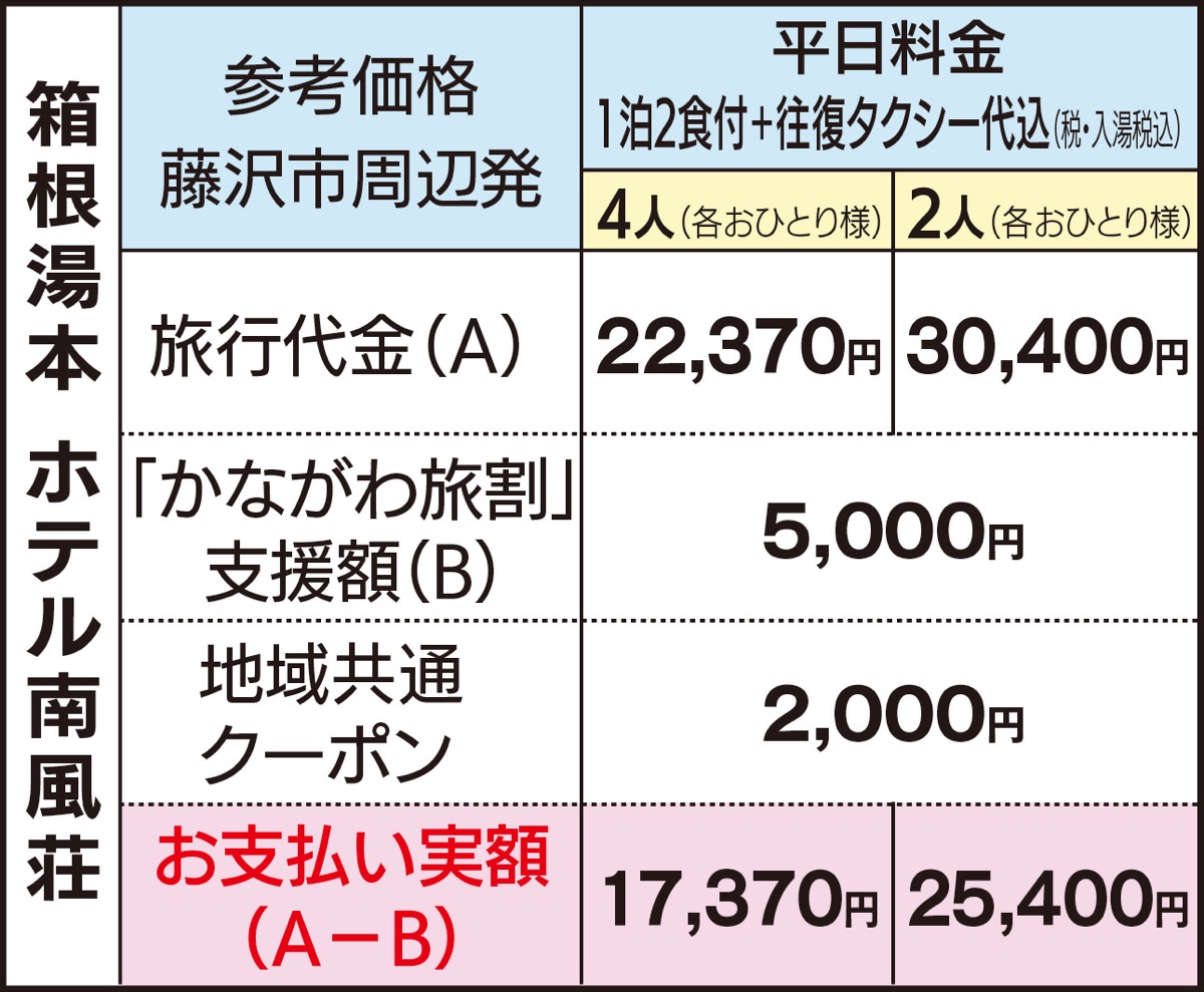 このプランは自宅から宿泊先までの往復をタクシーで移動する宿泊付ツアー。宿泊先は箱根や熱海など7つのホテルから選べ、地域共通クーポンも付与されてお得に旅が楽しめる。感染症対策をした車で、自宅からホテルまで直接移動できるため、高齢者や車いすでの利用も多い。詳細や申込は和光交通【電話】0466・23・5169。