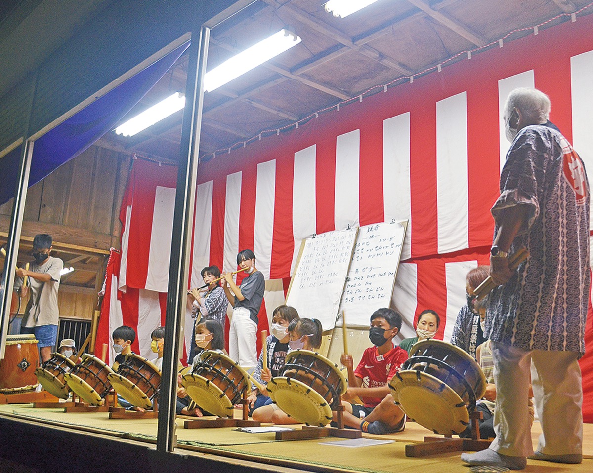 8月20日の午後7時、打戻の宇都母知神社の境内に祭囃子のにぎやかな音色が響き渡った。同保存会は、宇都母知神社の例大祭をはじめ地元の行事で祭囃子を披露している。新型コロナウイルスの影響で活動が停滞していたが、今年5月、3年ぶりに新メンバーを募集。例年加入者は2、3人ほどだったところ今年は5歳から小学6年生の子どもたち9人が加わった。金子さんは「久しぶりに活気が戻った。本当にうれしい」と話す。