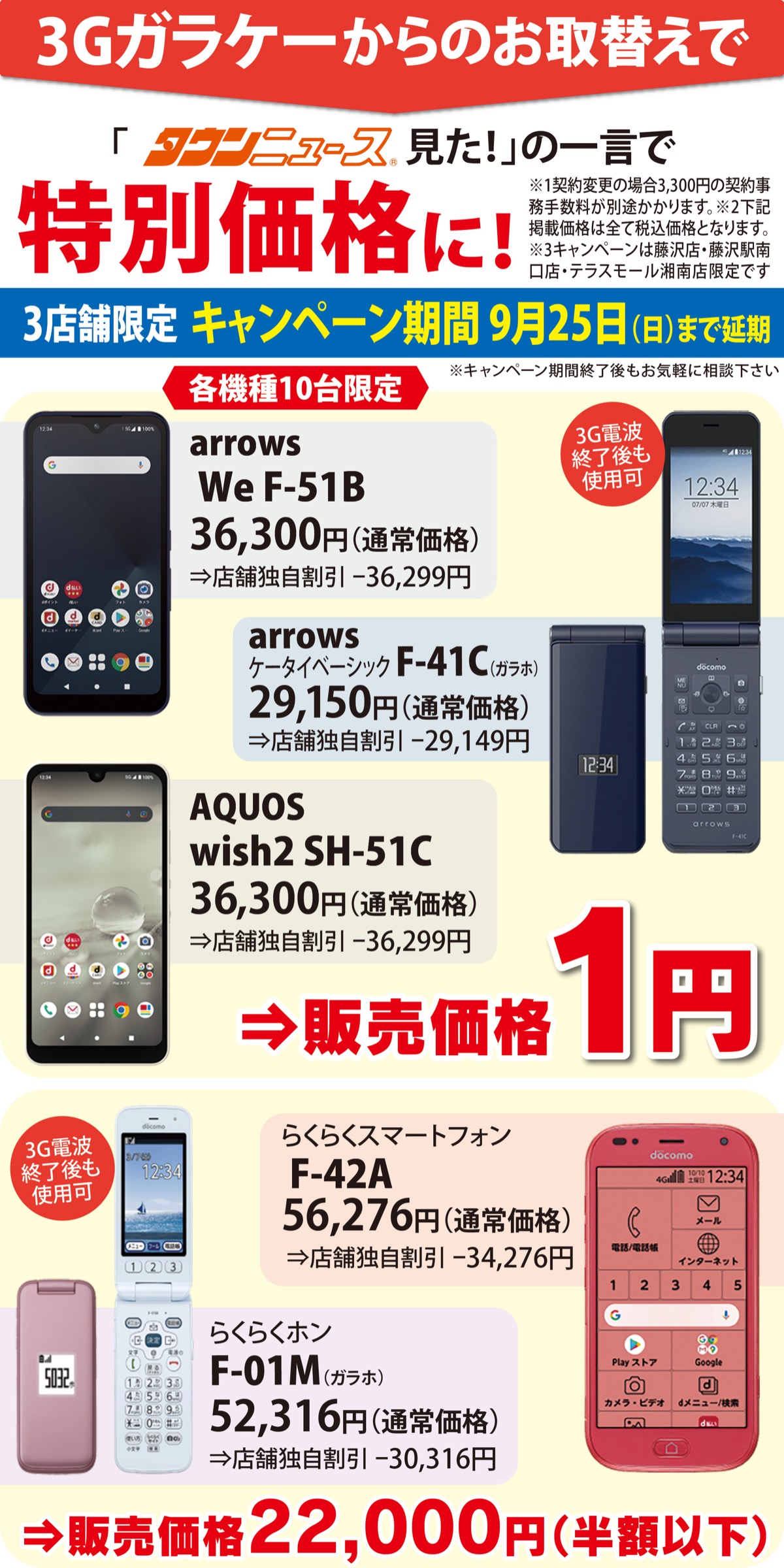そこで目を向けたいのが、藤沢市内3店舗のドコモショップが展開する「乗り換えキャンペーン」だ。現在、FOMAの折り畳み電話利用者を対象に、スマホや3G回線終了後も使えるガラホをなんと本体「1円」(事務手数料3300円別途)で販売。初心者に人気の「らくらくスマホ」「らくらくホン」も通常の半額以下になる。