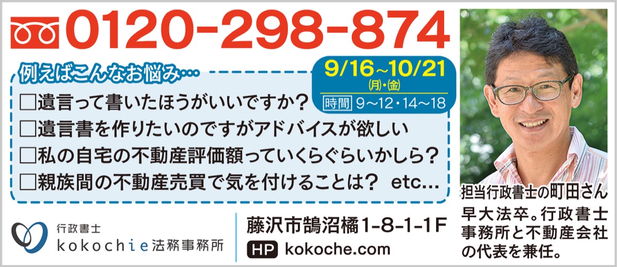 市内在住の行政書士の町田大光さんが「相続に直面した方の家族間トラブルや遺言がなくて困ったをなくしたい」との思いから遺言や相続、不動産の電話相談を開始、フリーダイヤルを設置した。期日、連絡先は下枠に記載。気軽に連絡を。