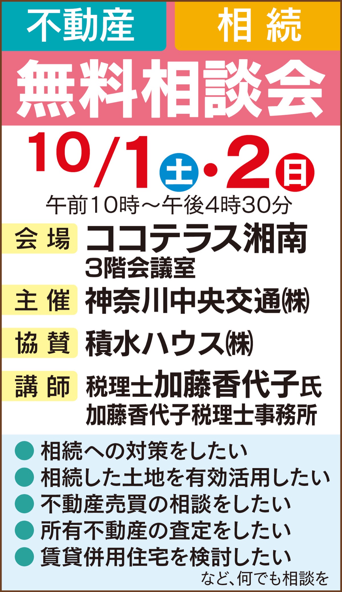 失敗しない不動産の相続・運用のために、税理士と宅地建物取引士が市民目線で親身に応じてくれる無料相談会が10月1日(土)と2日(日)、辻堂駅そばのココテラス湘南で開かれる。主催は神奈川中央交通(協賛/積水ハウス)。