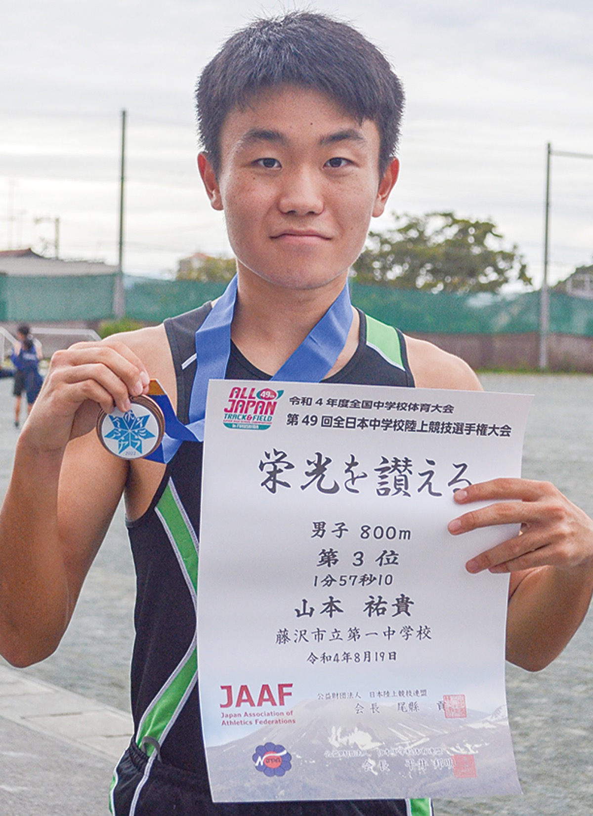 「全日本中学校陸上競技選手権大会」が先月21日まで開かれ、男子800m種目で第一中学校3年の山本祐貴さん(15)が3位入賞を果たした。タイムは1分57秒10。「優勝選手のタイムは、自分のベストの1分55秒台だった。1位を狙っていたので悔しい」といい、現在は10月下旬のジュニアオリンピック(1000m)出場に向けて練習に励む。陸上部顧問の村井裕也教諭(31)は山本さんを「客観的に自己分析できる」と評し、見守っている。
