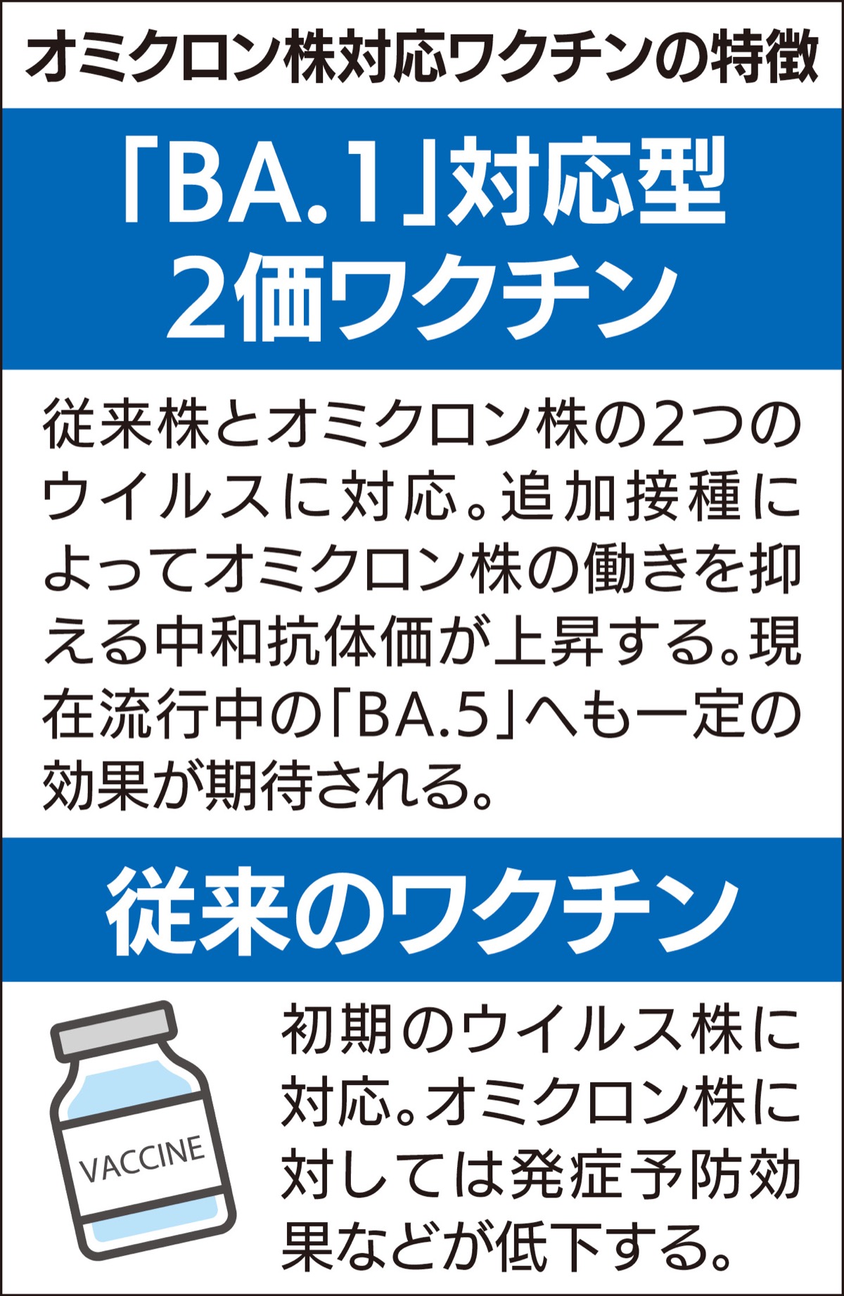 新ワクチンは、従来型にオミクロン株「BA.1」の成分を組み合わせたもの。厚生労働省によると、「オミクロン株に対して従来型を上回る重症化予防効果とともに持続期間が短い可能性があるものの、感染予防効果や発症予防効果も期待される」という。
