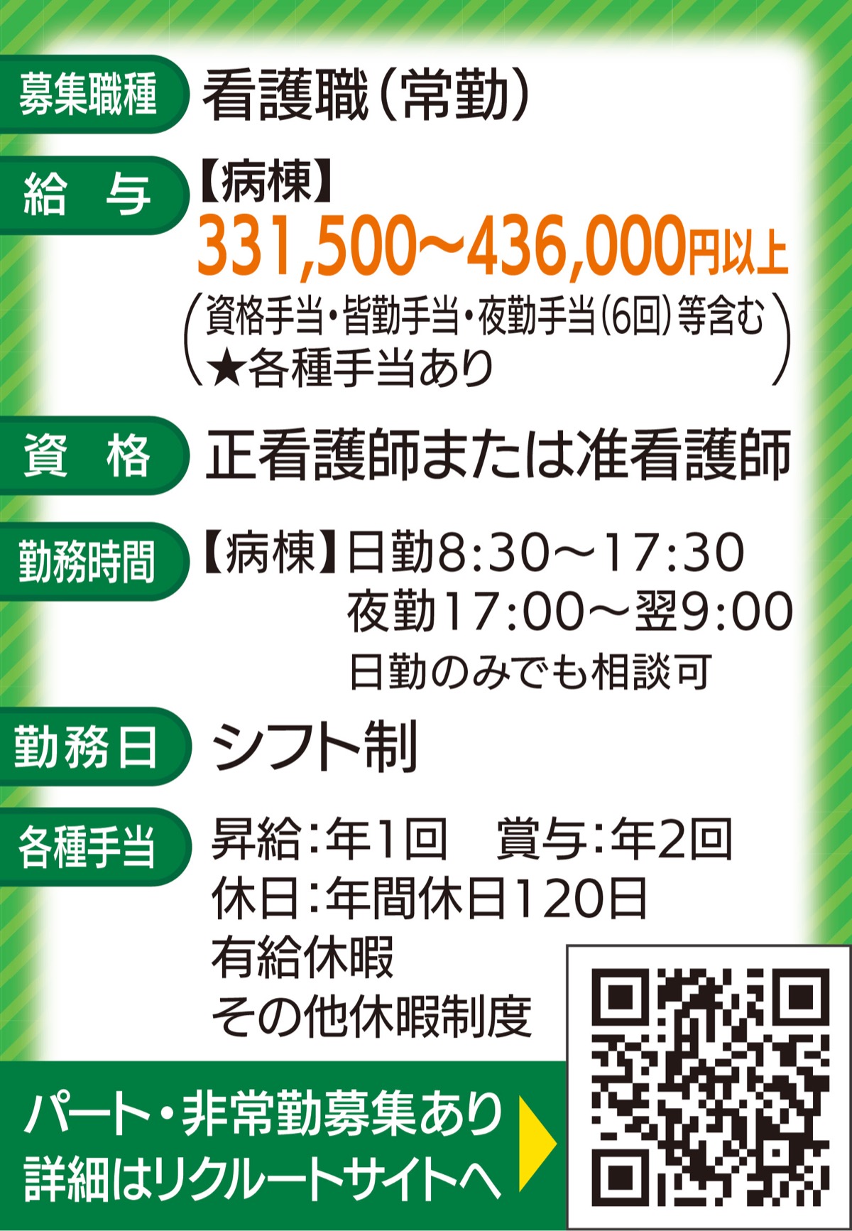 同院は2020年7月に開院。内科、呼吸器内科、脳神経内科、消化器内科、循環器内科、小児科、整形外科、リハビリテーション科の8科を設け外来、入院治療など地域課題に即した医療サービスを提供している。今回の募集は地域包括ケア病棟と医療療養病棟の増床に伴うもので、今秋に現在の80床から91床に増床を予定。正看護師、准看護師の資格を持つ人を対象に求人を募る。