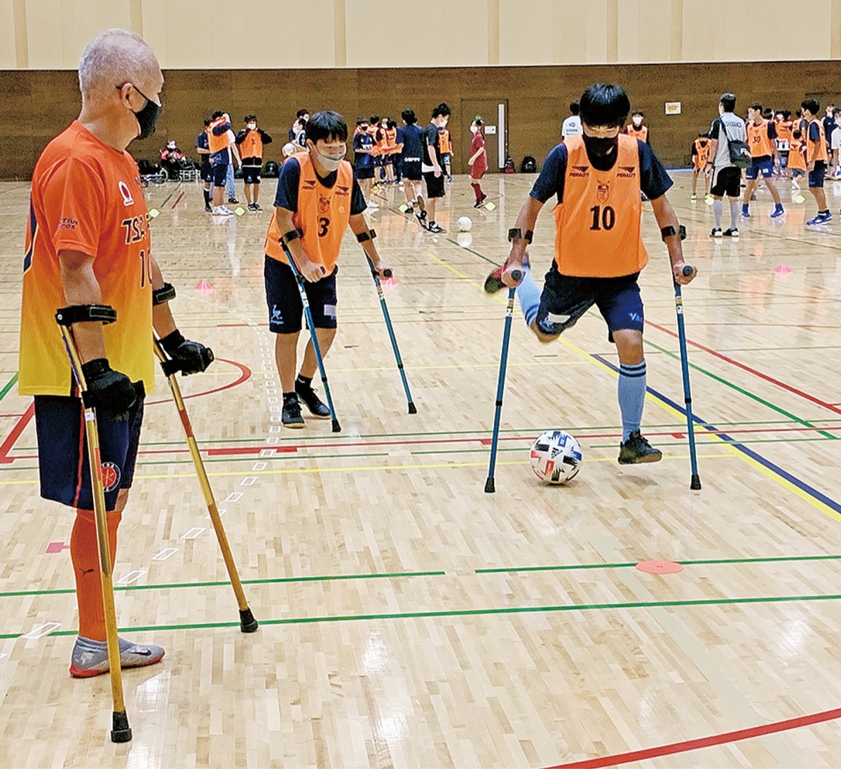 会場では足や手を失った人が杖を使ってプレーする「アンプティサッカー」や耳が不自由な人向けの「デフサッカー」など6種目を実施。アンプティサッカーでは杖の使い方や体重移動のコツを学んで参加者らがパスやシュートに挑んだ。
