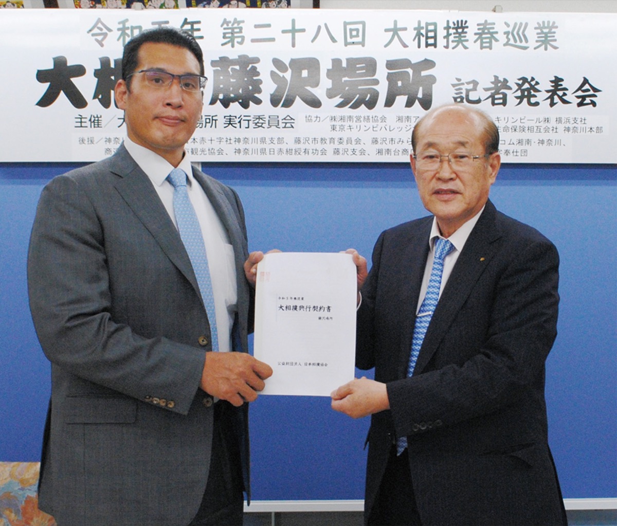 コロナ禍で3年連続で中止となっていた「大相撲藤沢場所」(最上重夫勧進元/(株)湘南営繕協会代表取締役)が来年4月15日(土)に開催されることが決まった。11日、実行委員会事務局となる同社で(公財)日本相撲協会巡業部の立田川親方(元小結・豊真将)と巡業契約を交わした。会場は藤沢市秋葉台文化体育館。28回目となる。