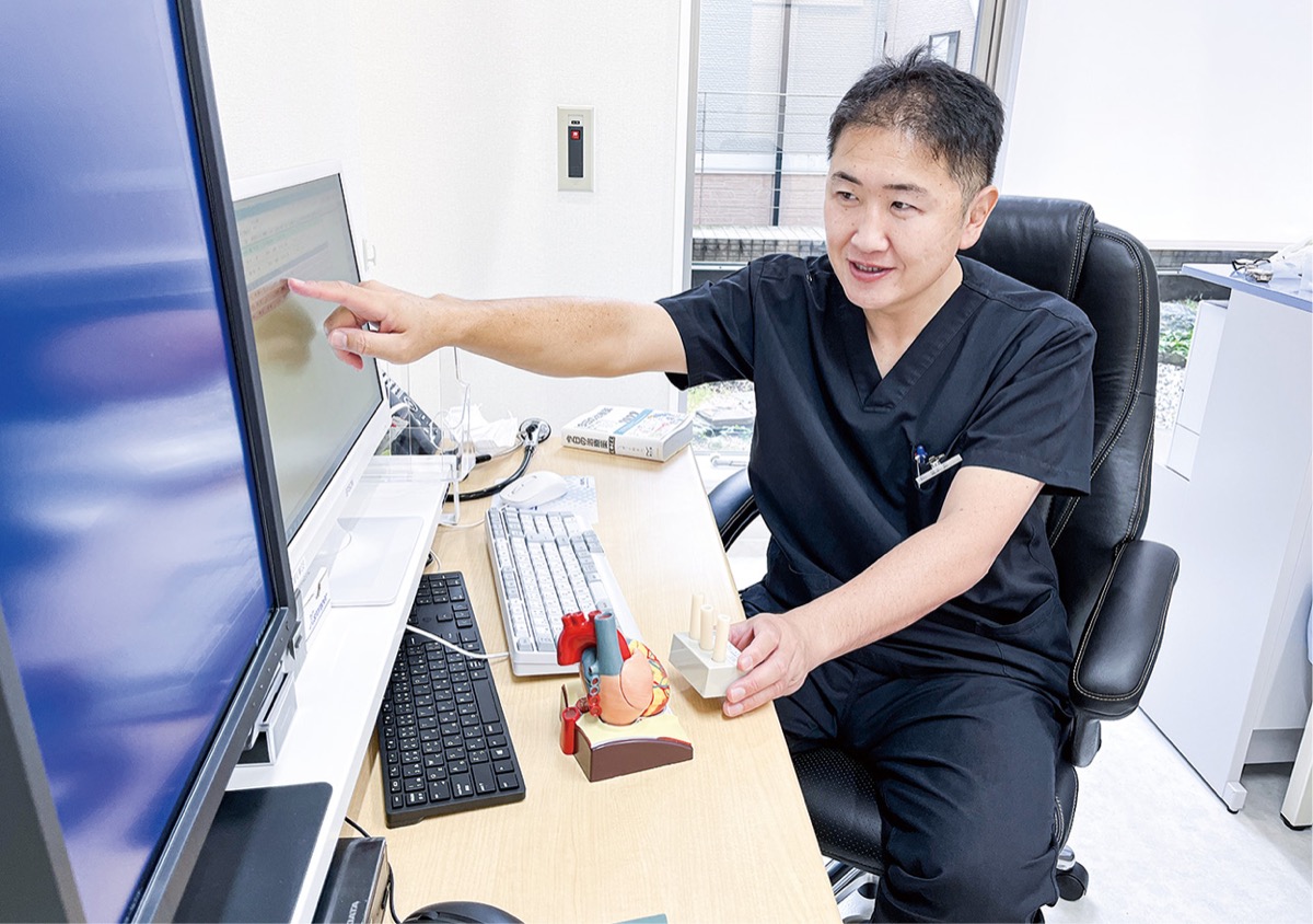 心臓血管や下肢静脈瘤治療、メディカルアートメイクを中心に提供。最も力を入れる下肢静脈瘤治療は、診察と超音波検査で原因を突き止め、一人ひとりに合わせた治療法を提案する。