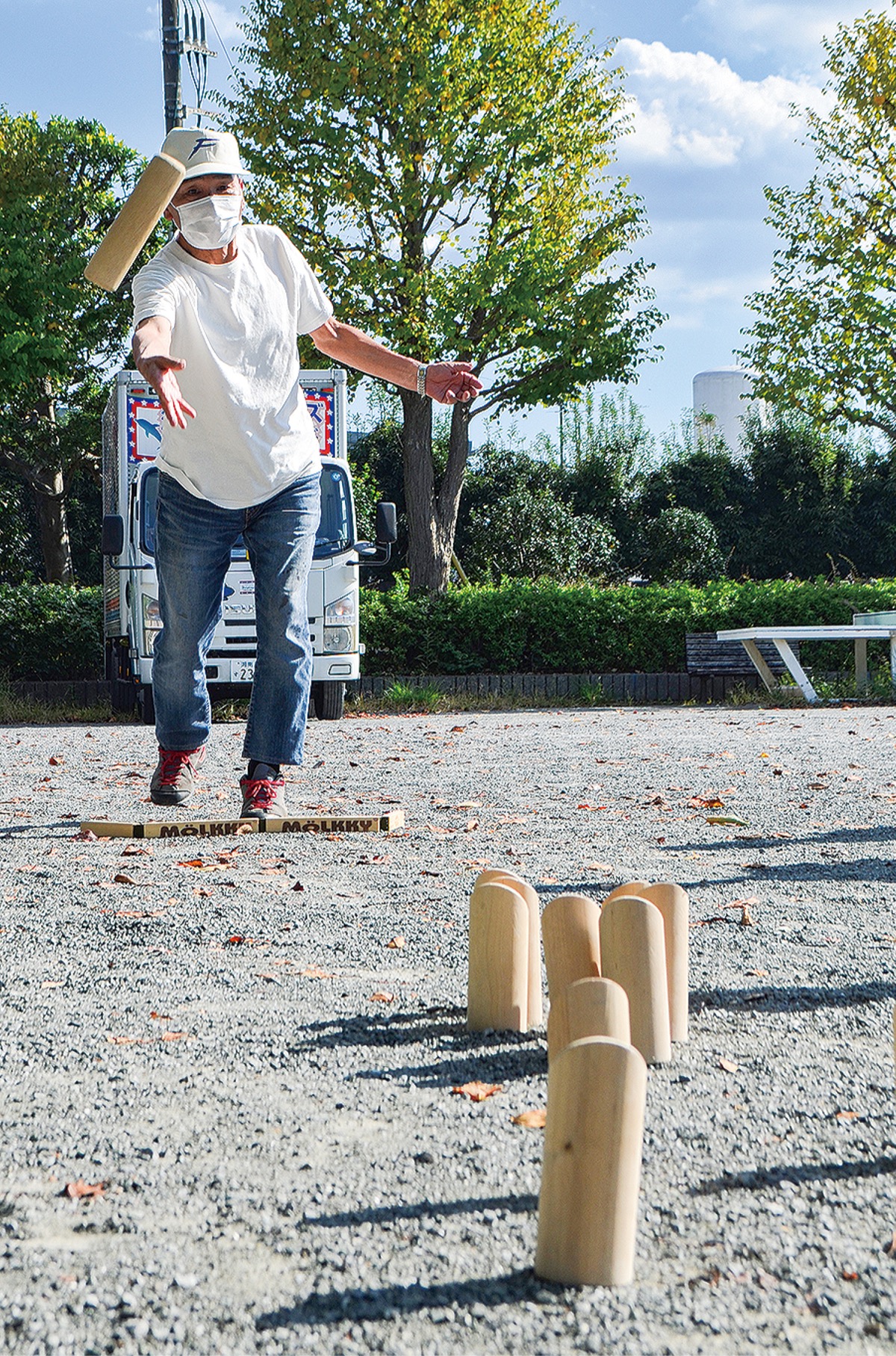 1日の昼下がり、秋葉台公園の一角で木と木がぶつかり合う小気味良い音が響いた。40〜70代の男女9人が木の棒を下手投げし、命中すると「うまいね」「惜しい」など歓声や拍手が送られる。