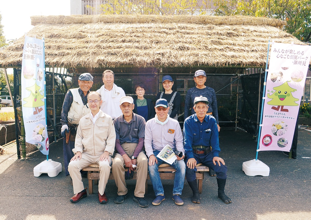 御所見地区郷土づくり推進会議のメンバーが、15日と16日に御所見市民センター・公民館で行われた文化祭で使用してもらおうと、わらぶき屋根の休憩所を制作した。