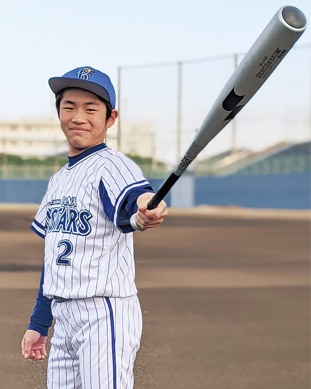 今夏、ベイスターズジュニアのセレクションに挑戦した。約960人の応募から狭き門を突破し、40人がゲーム形式で行う最終審査に進むと、内野守備でアピール。打席は振るわなかったが、最終打席に死球で出塁すると、持ち前の気合で本塁へヘッドスライディング。判定はセーフ。「100%の力をアピールできた」とメンバー入りを果たした。現在は土日などにチーム練習を行い結束を高めている。背番号は、DeNAの選手で憧れという牧秀悟選手と同じ「2」だ。