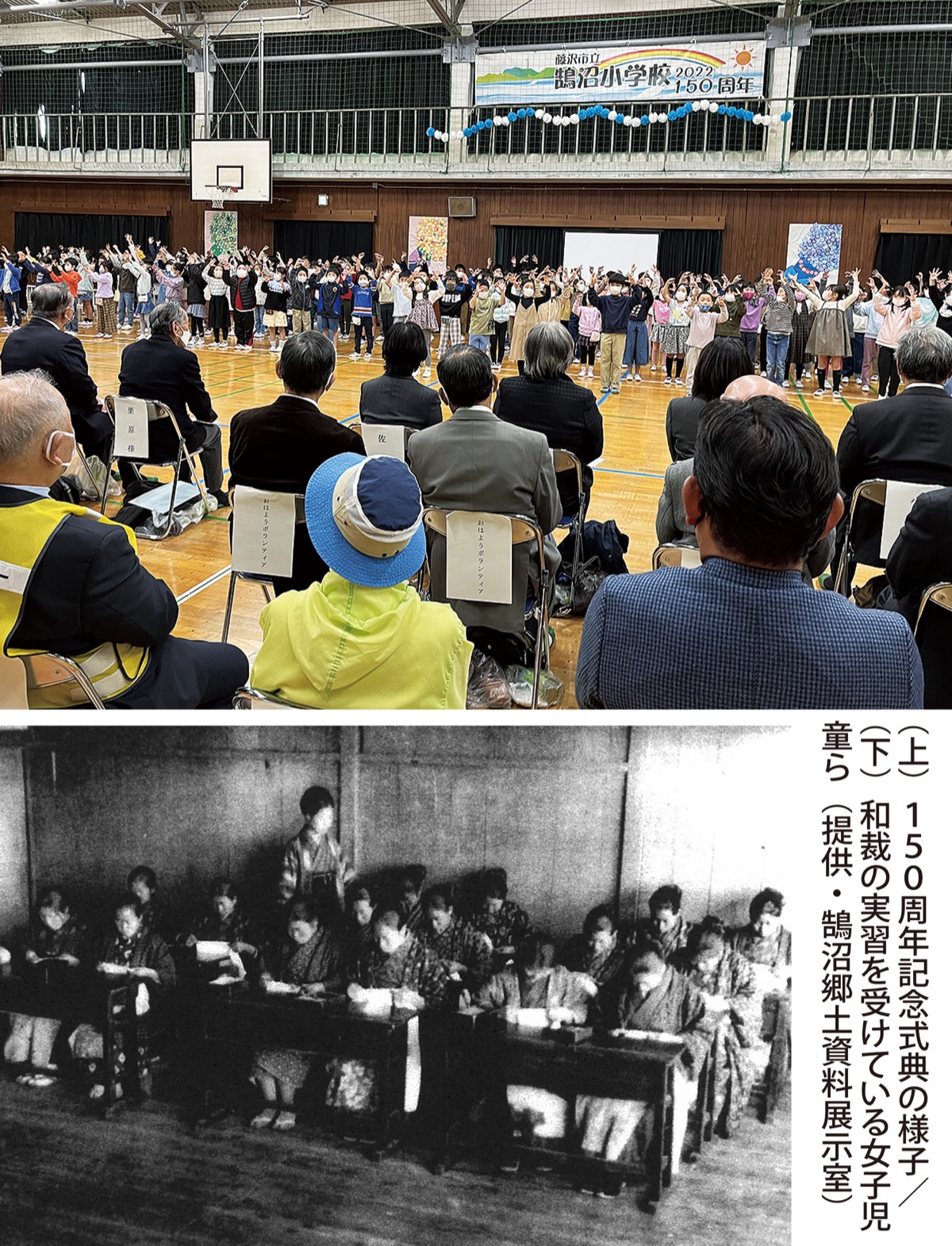 記念式典では、開会式に先立ち亀本校長が「大切に育て守ってもらった鵠沼小を同じように未来につなげていきたい」とあいさつ。1年生による校歌斉唱を皮切りに、学年ごとに合唱やソーラン節、エイサーの演技などを披露した。