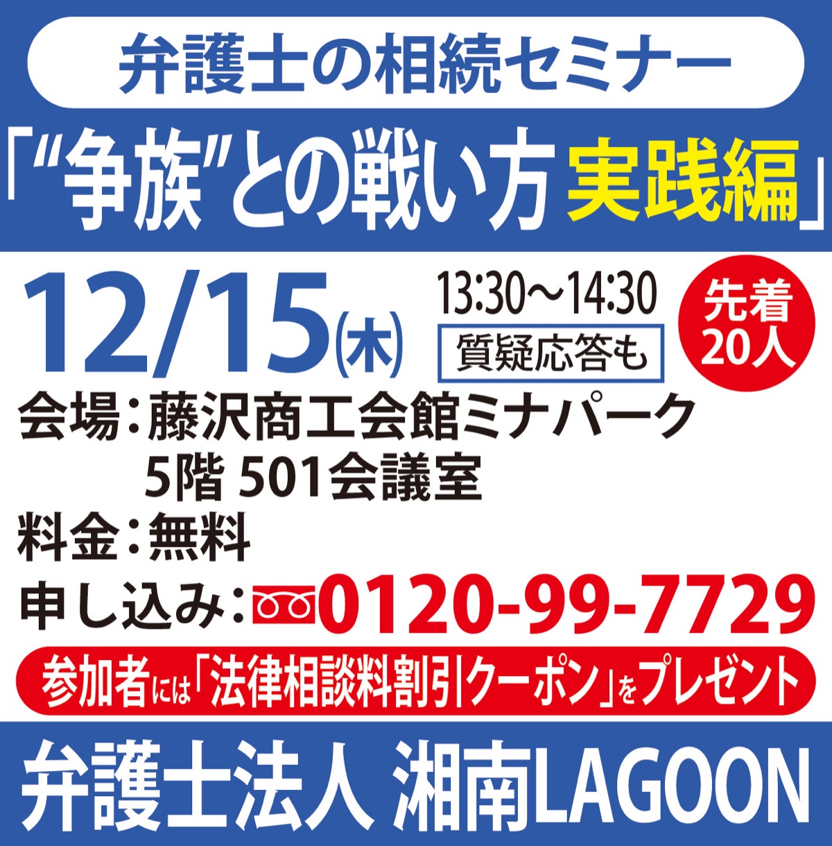 藤沢で10年、地域に寄り添う「弁護士法人湘南LAGOON」は、藤沢商工会館ミナパークで12月15日(木)、「”争族”との戦い方実践編」と題しセミナーを開催する。身近に家族がいない人の「おひとりさま終活」など、弁護士が困り事に寄り添い相続に関するあらゆる悩みに答える。