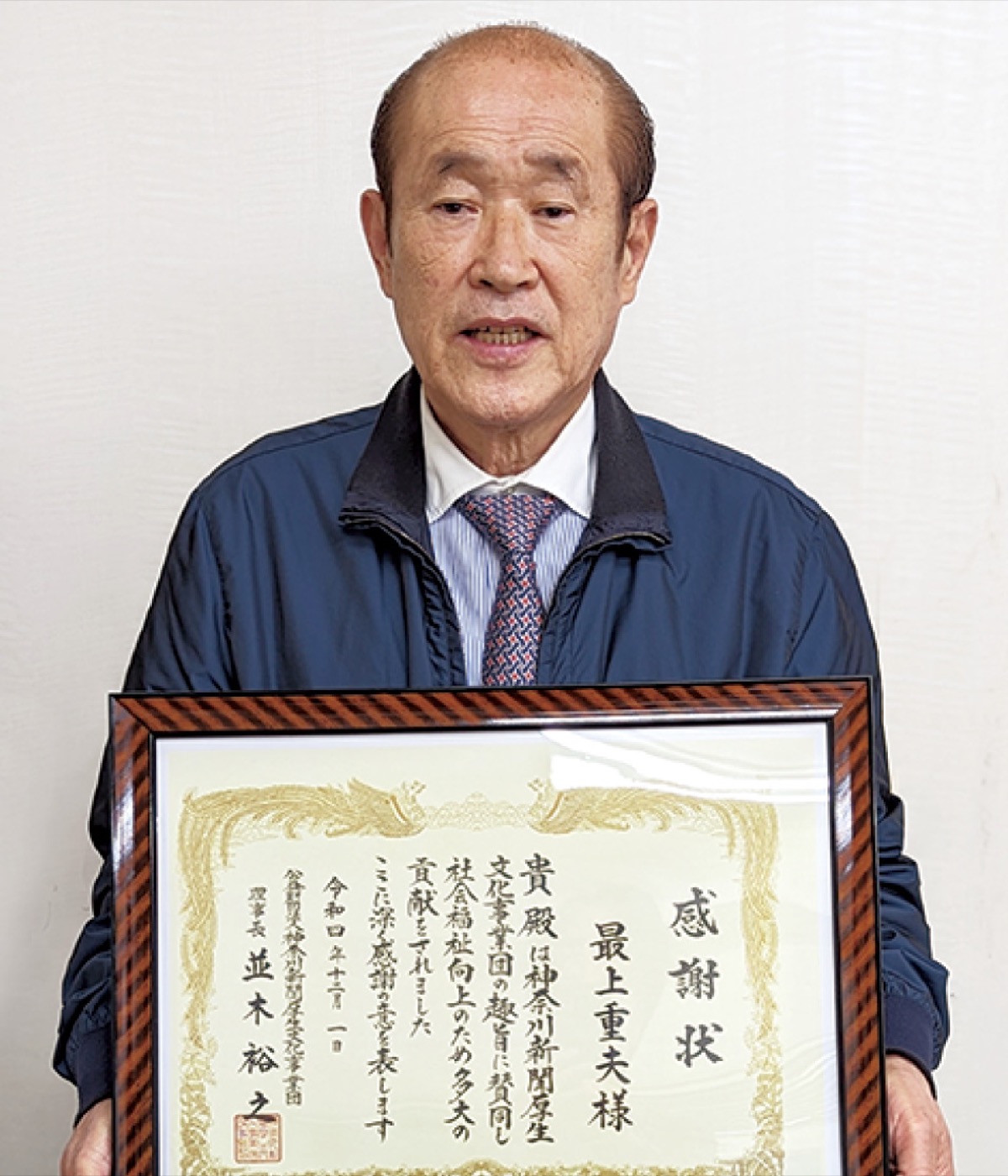 亀井野の湘南営繕協会社長で、大相撲藤沢場所勧進元の最上重夫さん(73)=写真=が1日、神奈川新聞厚生文化事業団から感謝状を贈られた。