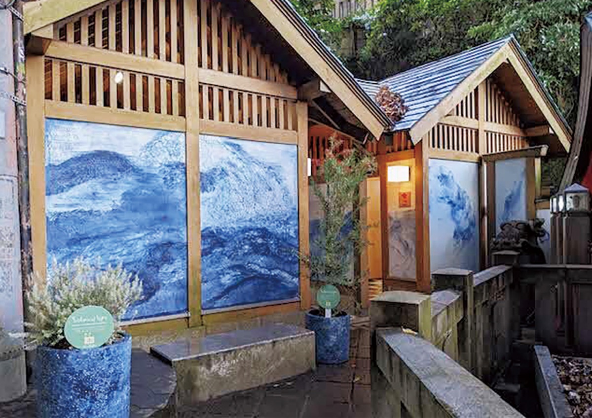 装飾されたのは、江の島の頂上につながる「江の島エスカー」横にある公衆トイレ。市内に拠点を置き、藍染めと左官を融合した新たな技術で創作活動を行っている(株)アートモリヤの守谷玲太さんが手掛けた。
