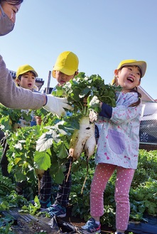 別日は、姉妹園の「湘南わもっか保育園」の園児らも収穫。大根は園児たちが自宅へ持ち帰ったほか、給食や食育の一環の料理教室で活用されるという。
