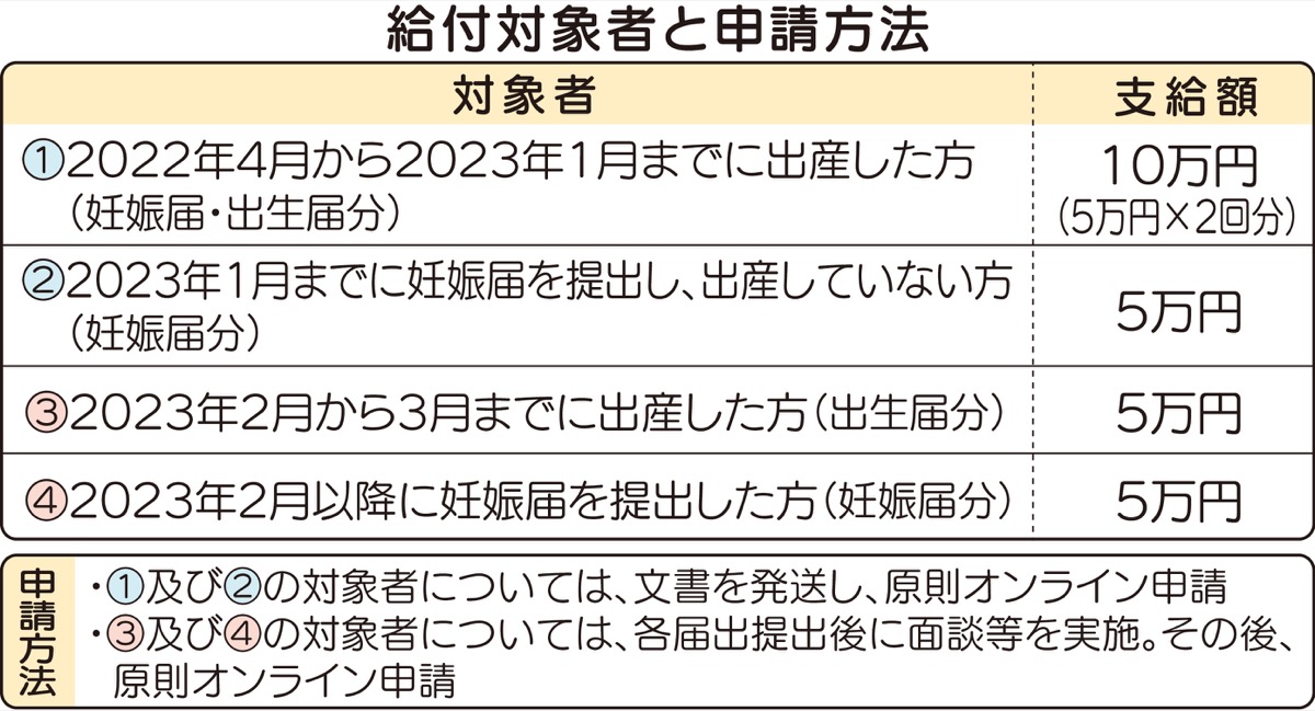 給付には申請が必要。昨年4月から今年1月までに出産した人、今年1月までに妊娠届を提出し、出産していない人には、市が今月下旬から案内書を発送。それ以外の対象者は妊娠届や出産届提出後に原則オンラインで申請を受け付ける。
