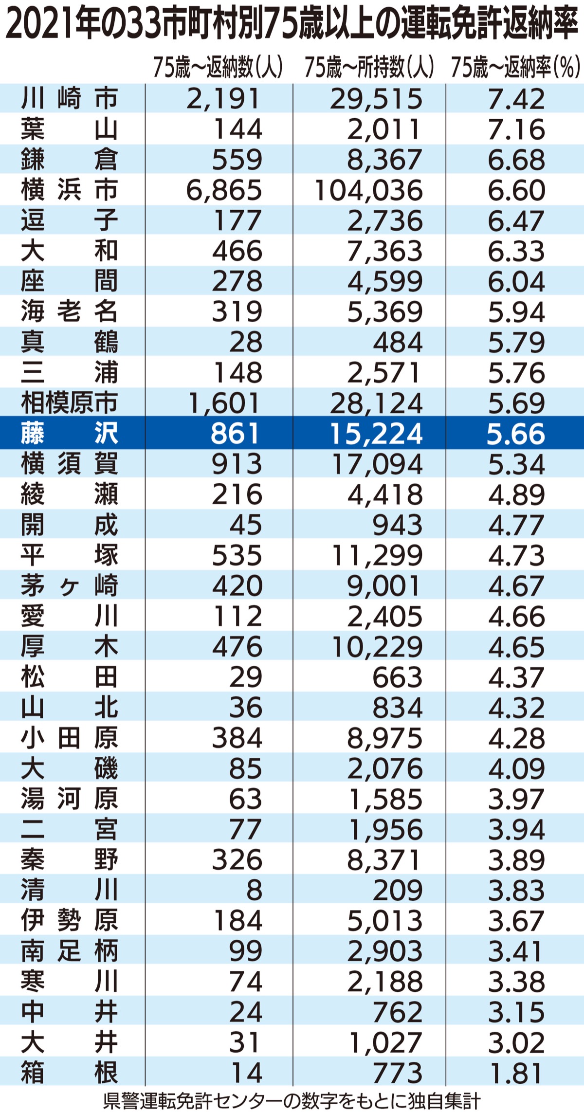 75歳以上の後期高齢ドライバーの運転免許返納状況についてタウンニュース社がこのほど、県内33市町村を対象に調査したところ、藤沢市では2021年に自主返納したのは免許保有者の5・66%にあたる861人だったことが分かった。17・68人に1人が返納した計算で、県下12番目、県平均の5・87%を0・21ポイント下回る。また自治体間では最大4倍の地域差があることも明らかになった。