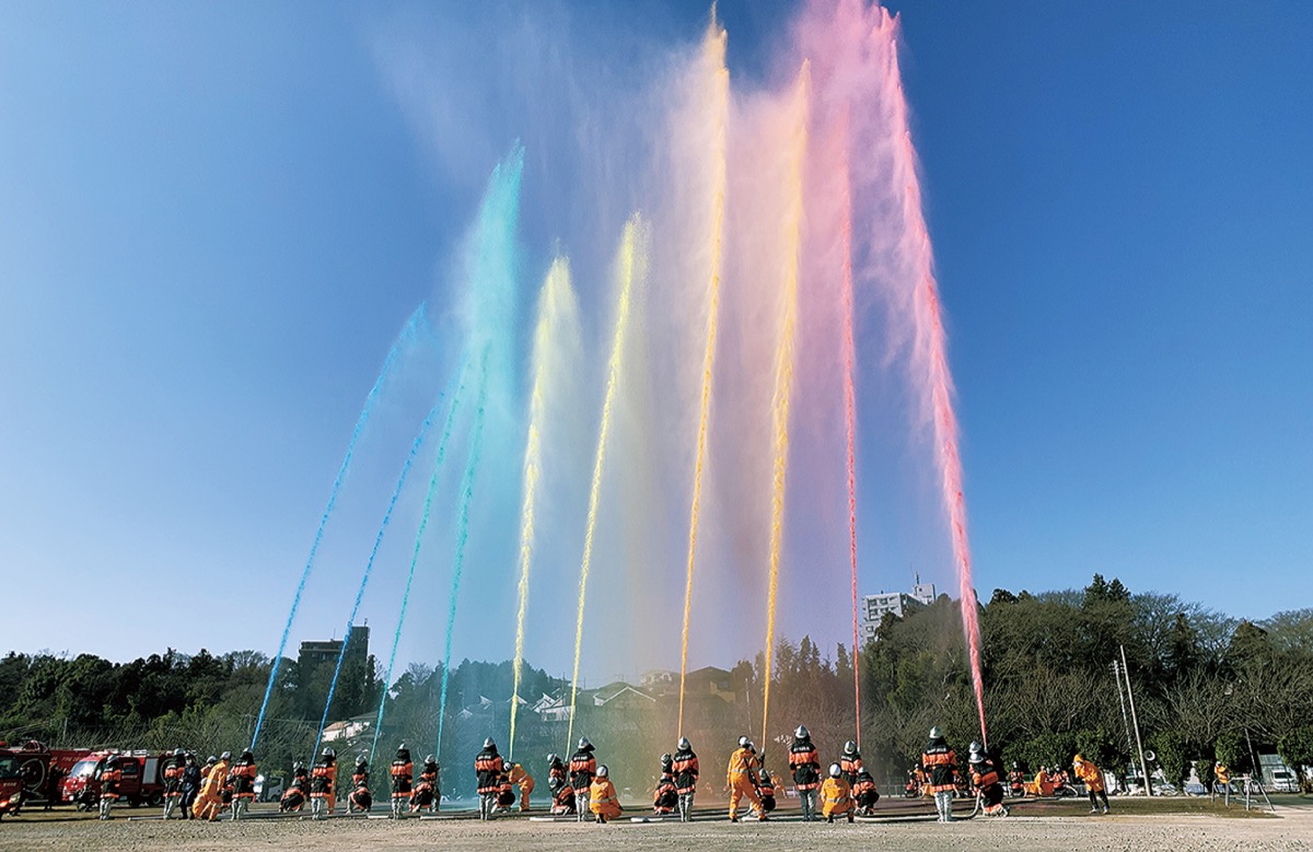 消防団31分団中10分団が参加した一斉放水では、冬晴れの青空に赤や青、黄色など色鮮やかなアーチが空にかかり、来場者の目を楽しませていた。