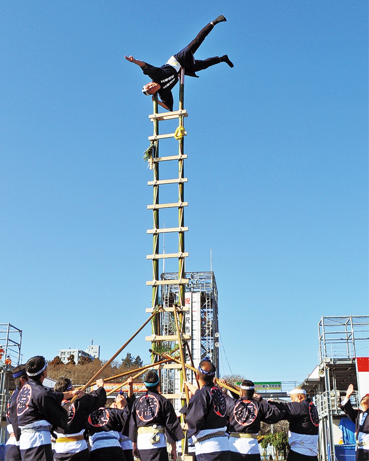 はしご乗りでは、藤沢鳶職連合会の職員らが木やりと纏(まとい)振りともに妙技を披露。はしごを軽快に駆け上がり、片足で体を支えたり、逆さまになるなどの離れ技を披露すると、詰めかけた観客からは歓声があがり、盛んにスマートフォンなどで写真を撮影していた。