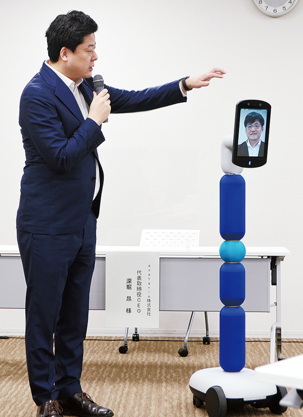 高さ150cmほどで、タッチパネル式の画面に操作者の顔を映すことが可能。カメラやマイク機能も備え、遠隔地の撮影や会話ができる。同社によると「既存のビデオ通話やウェブ会議システムと異なり、操作する人の意思で遠隔地の空間を動き回れることが特徴」という。