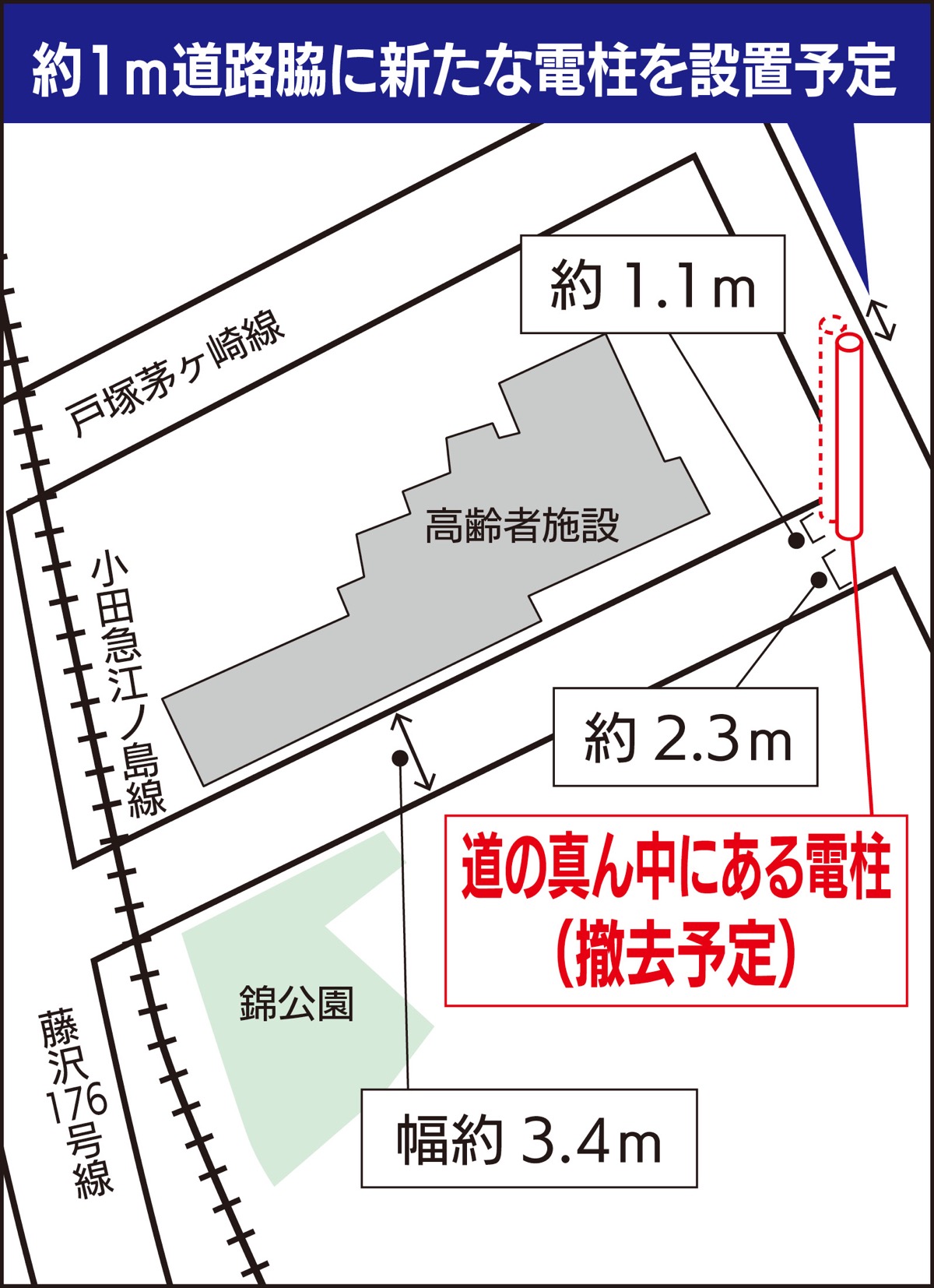 一方、長年住む住民からは困惑の声も。「この場所に電柱があるのは当たり前の光景。車の通行が少なく済んでいた」。近隣保育所の園児らが通り添いの錦公園へ散歩する姿も日々見られ「この電柱が無くなっても、安全確保の対策はしてほしい」とこぼした。