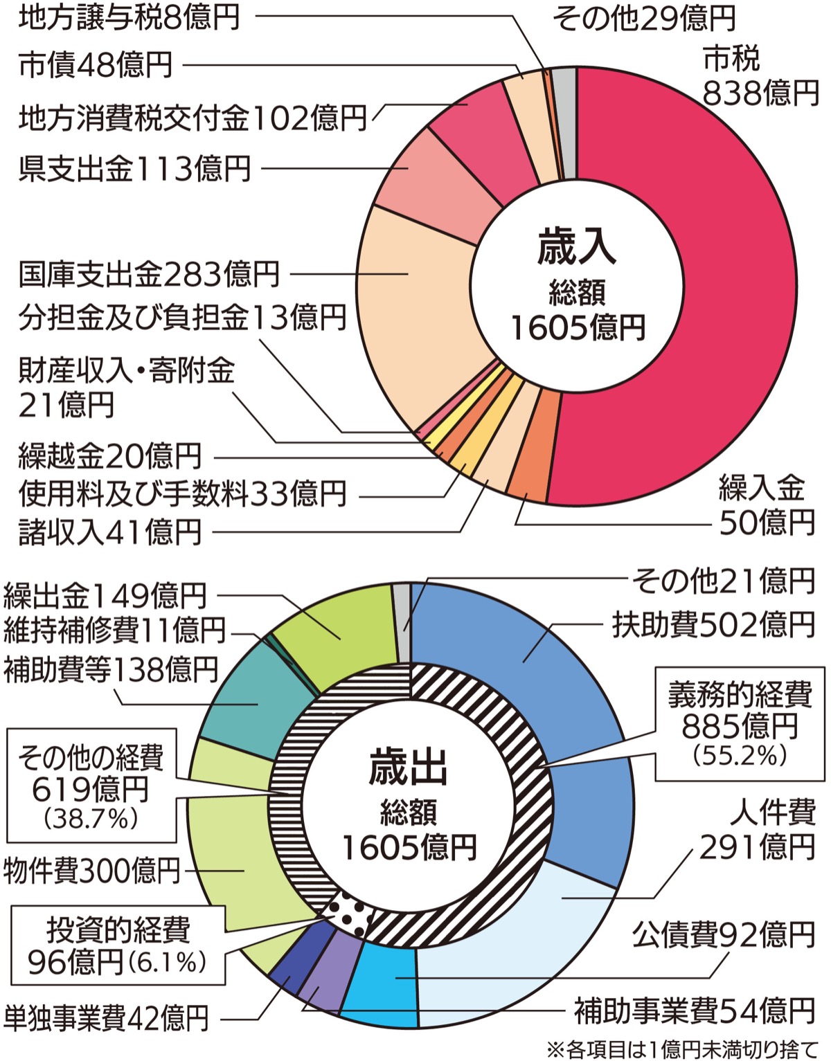 一方、歳出では人件費、扶助費、公債費を合わせた義務的経費が1・2%増の約885億9100万円。歳出に占める比率は55・2%で過去10年間では最大値となった。社会保障関連に充てる扶助費が増加の一途を辿っているのが要因で、約502億1500万円に達した。