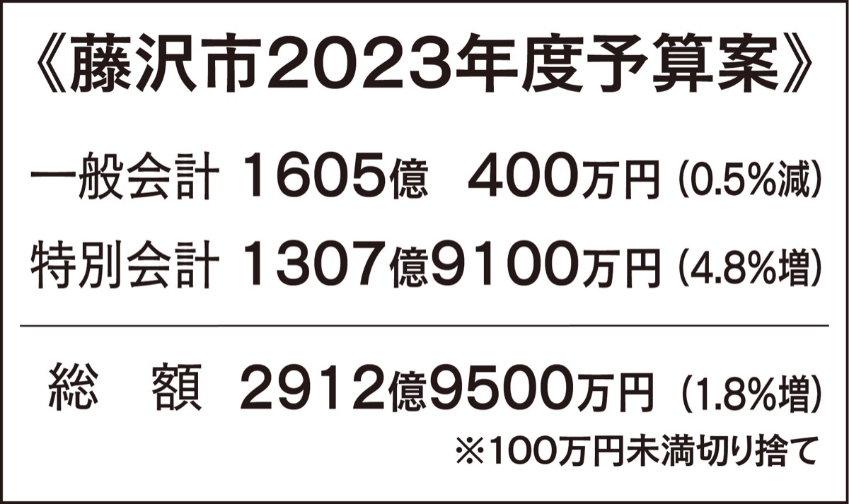 藤沢市は7日、2023年度の当初予算案を発表した。一般会計は前年度比0・5%減の約1605億円で、過去最大だった昨年度に次ぐ過去2番目の規模となった。子育て世帯の流入に伴う人口増を背景に、子育て支援や教育を重点的に配分。さらに藤沢駅周辺の再整備を始めとする都市機能の強化やデジタル化など未来志向型の予算編成となった。
