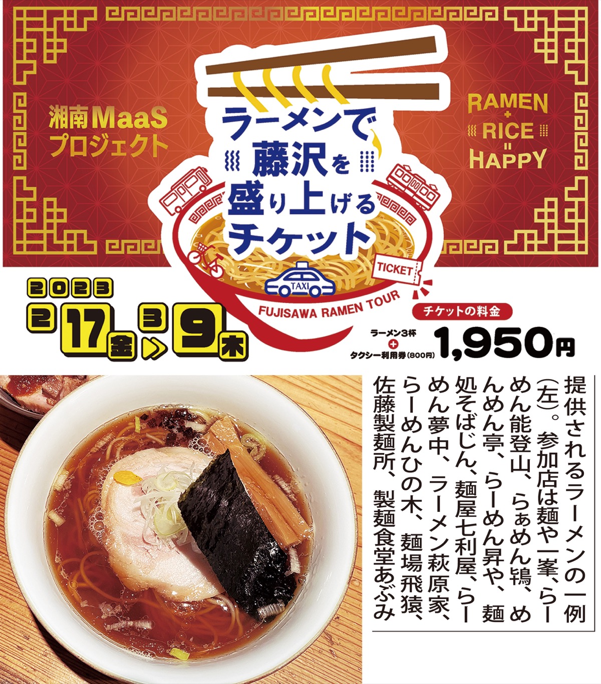 江ノ島電鉄がきょう2月17日(金)から市内のラーメン店13店舗とタクシー14社と連携したイベントを初開催する。ラーメンとタクシー券がセットになった期間限定の電子チケットを販売。食という観光コンテンツを通じ、市内の周遊や地域活性化を後押しする。