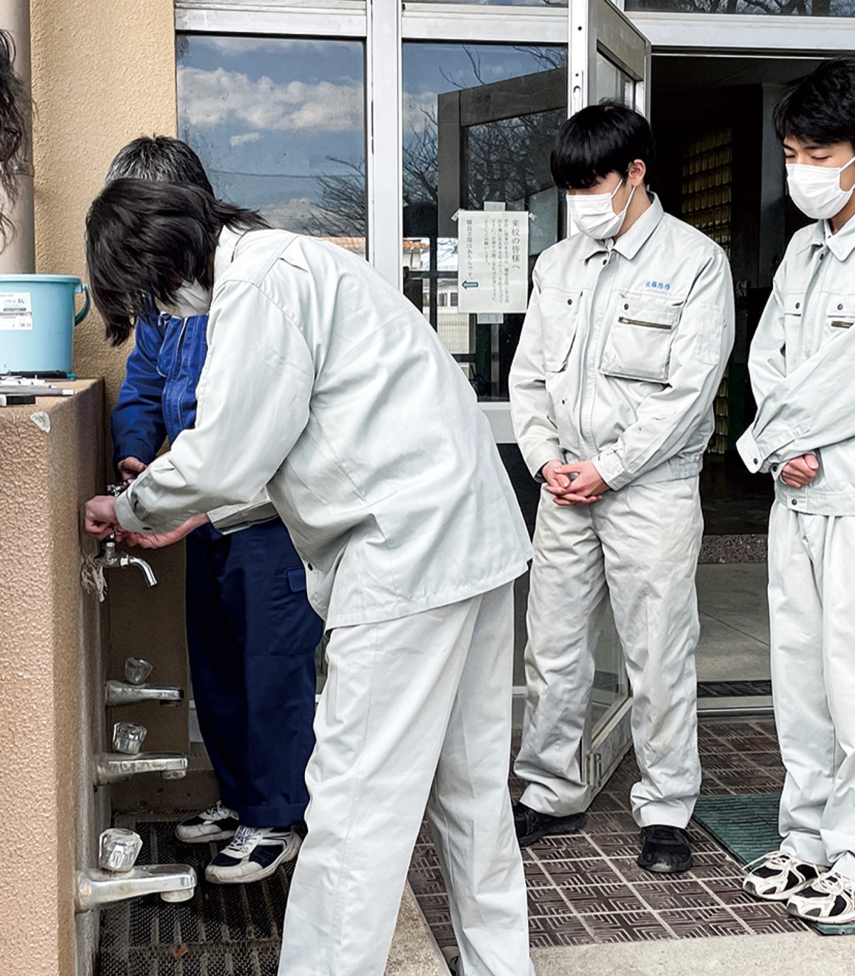 藤沢工科高校の生徒10人が先月31日、亀井野小学校を訪れ、同小の昇降口にある蛇口6カ所の交換作業を行った。新型コロナウイルスの感染リスク低減のため、水道蛇口の取っ手を回転式からレバー式に交換。高校生らが感染対策にひと役買った。
