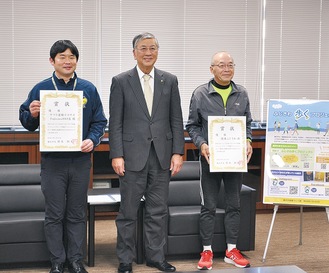 藤沢市の健康づくり事業「ふじさわ歩くプロジェクト」で、市内事業所や団体が歩数計アプリに記録された平均歩数を競う「グループ歩数チャレンジ」の結果がこのほど発表され、事業所の部は「ヤマト運輸ネコサポFujisawaSST店」、任意団体の部では「健康ふじさわ」が優勝した。両者は市役所に招かれ、鈴木恒夫市長から表彰状が贈られた。