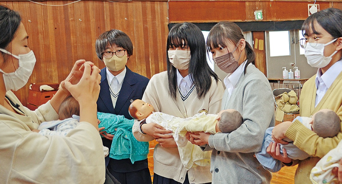 その後はグループに分かれ妊婦や子育て体験を行った。妊娠後期を想定した重さ約8kgのマタニティージャケット着用や、約3kgの赤ちゃん人形を抱っこした生徒らは「思ったより重い」「持つのが少し怖い」など興味津々な様子だった。