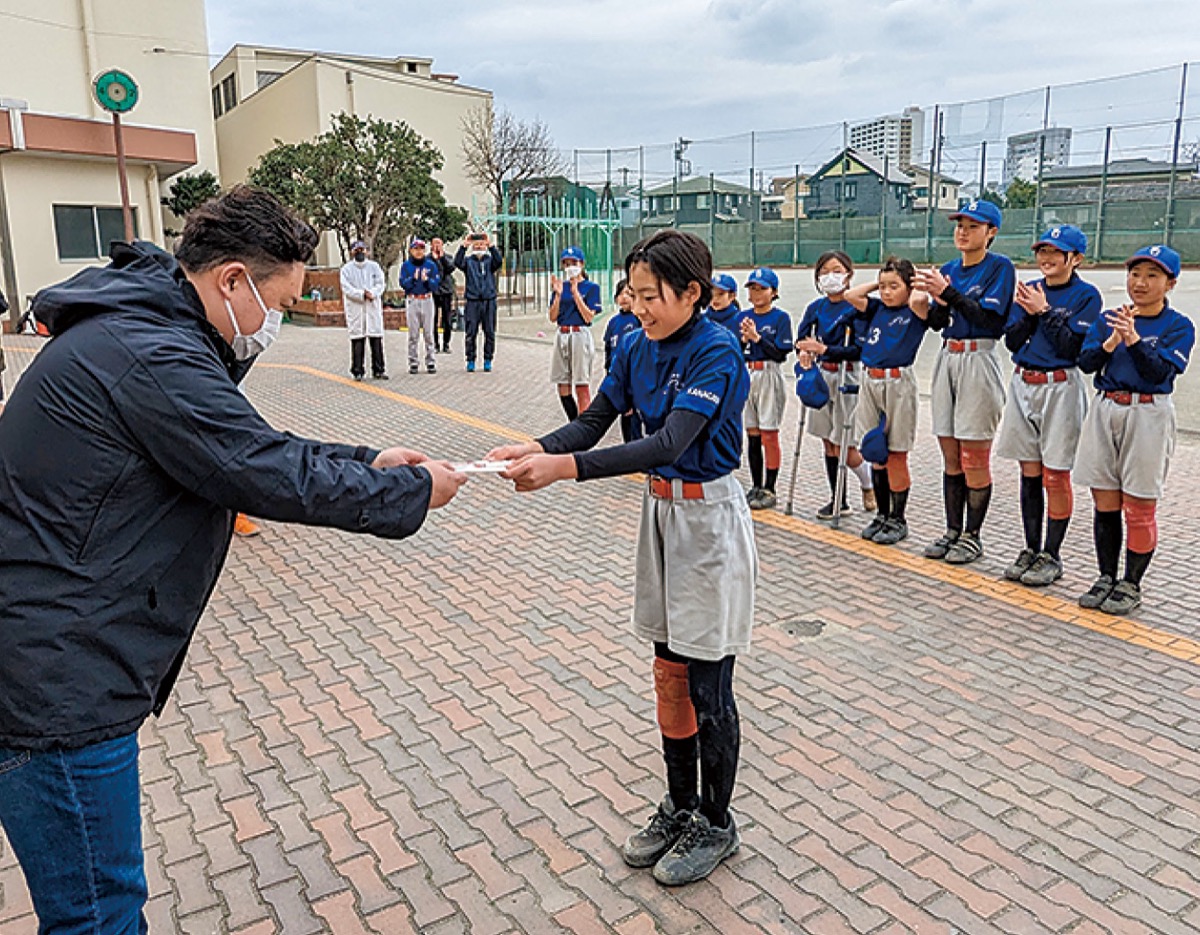 今月25日から始まる全国大会に出場する少女ソフトボールチーム「湘南ガールズ」に5日、市内2社から支援金が手渡された。