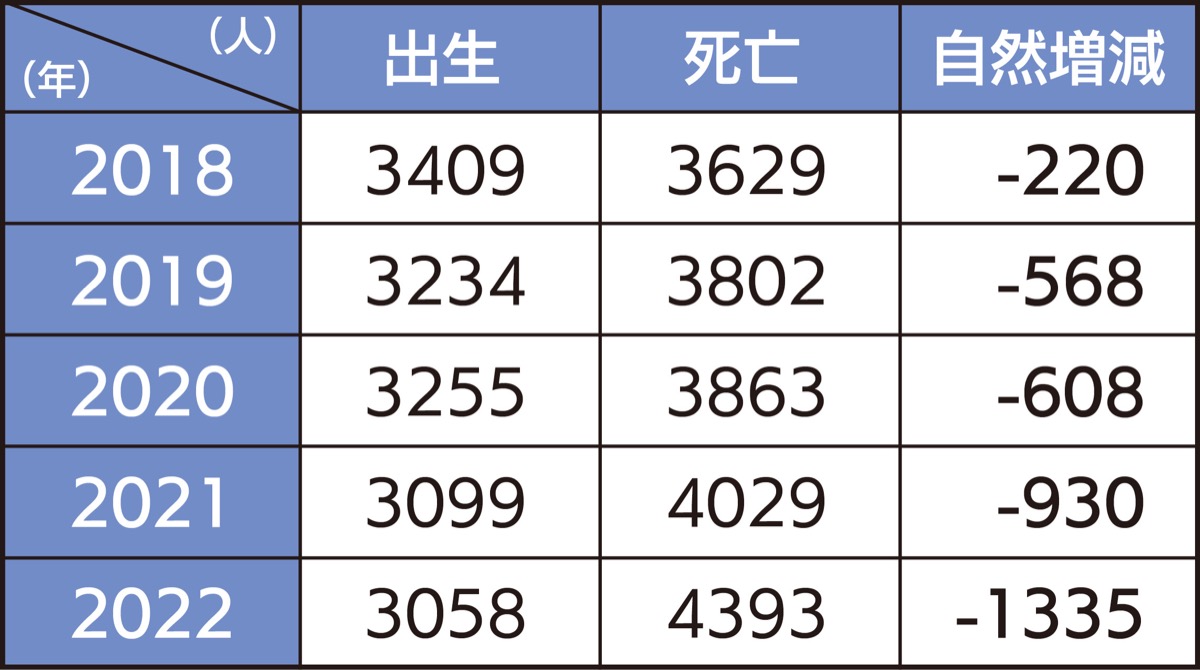 市の統計年報によると、前年比で41人減。第2次ベビーブームの1973年の6006人をピークに出生数は減少傾向に転じ、2022年は半数近くまで減った。政令指定都市以外では1番多い出生数となっている。出生数から死亡数を引いた「自然増」では1335人減と2009年から13年連続で減少した。