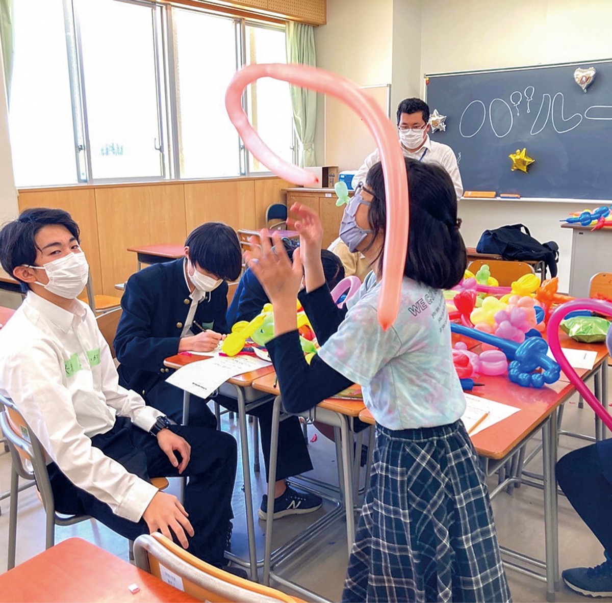 生徒がオリジナル講座を開き、児童が興味があるジャンルを受講する。地域の異年齢交流を目的に、20年以上続けられている。コロナ禍で実際に会場を使った実施は4年ぶり。20講座が開かれた。お菓子作り体験をした5年生児童は「おいしくできた。やさしくしてくれて楽しかった」と笑みを浮かべる。