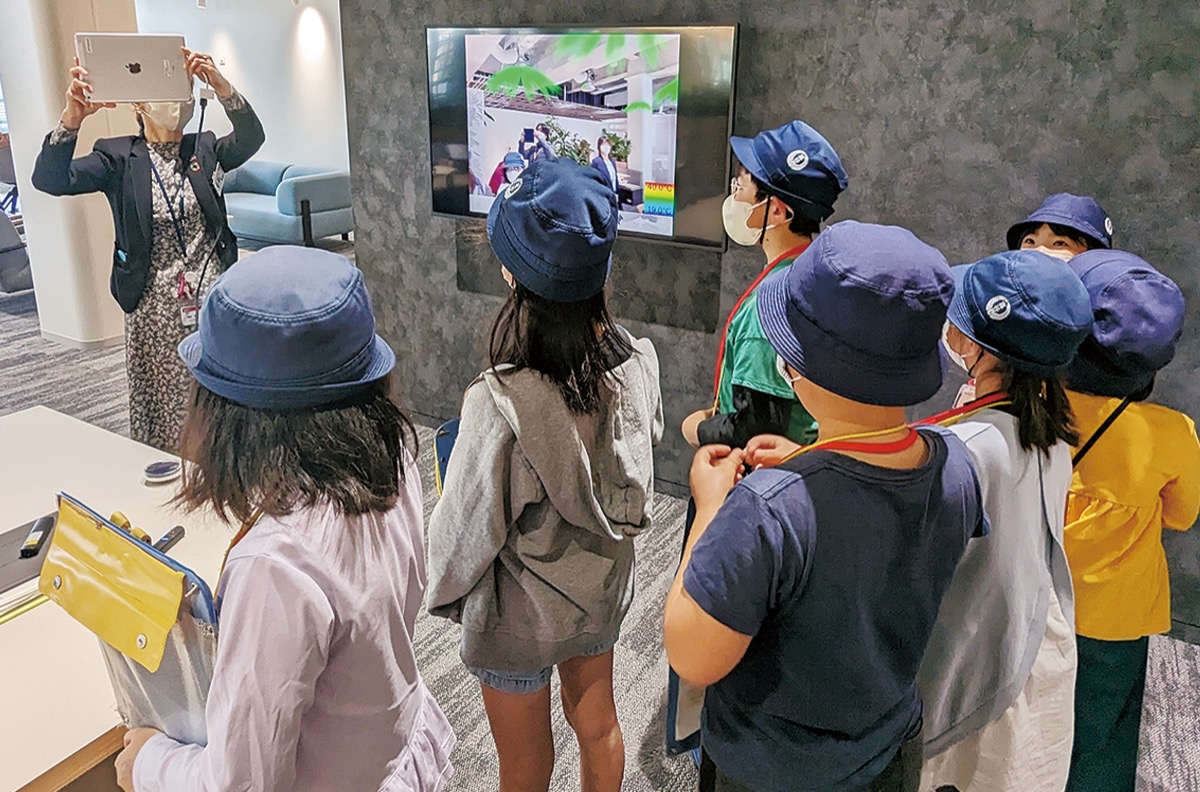 最終日の9日には29人の児童が参加。座学で省エネを学んだ後、施設内を見学。太陽のエネルギーで湯をつくり冷暖房に活かす蓄熱槽や、人の存在に合わせて機能する空調を見学。人感センサーで省エネ化された廊下では、歩く先の照明が点いていき、後ろの照明が消えていくシステムを体験、驚きの声を上げていた。